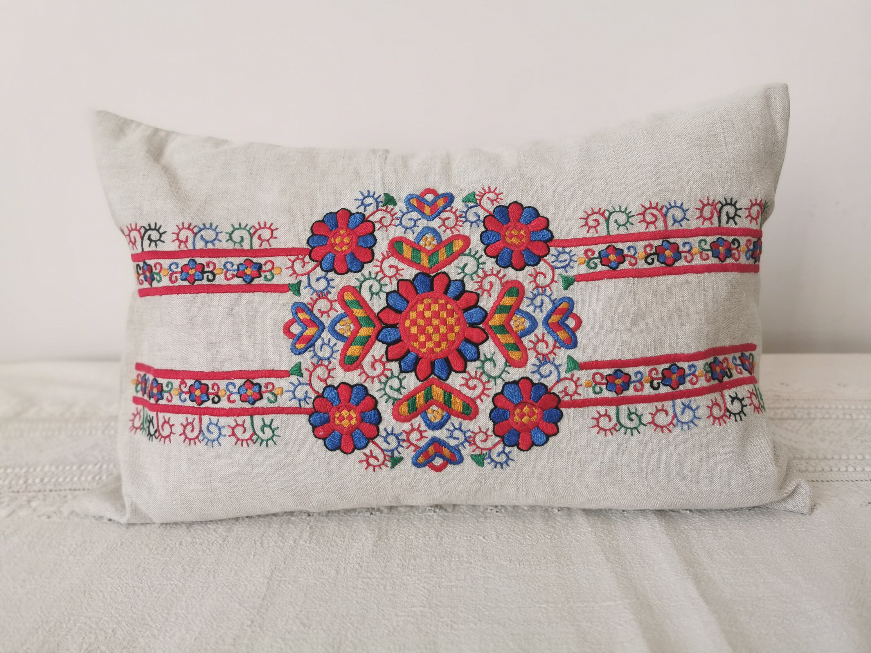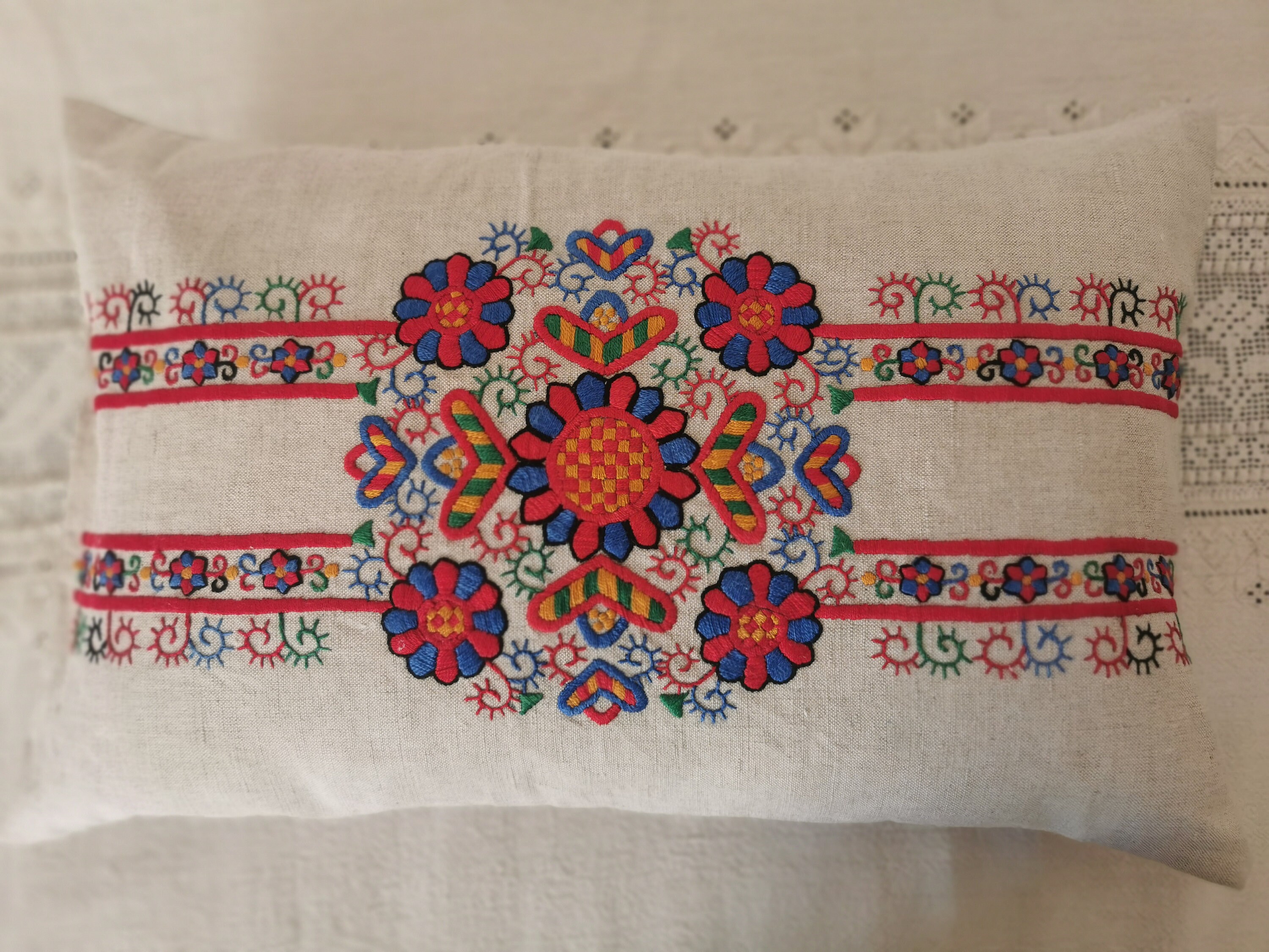 Cushion cover from vintage Buzsak embroidery I have added a plain vintage bacl and wooden button fastening Buzsak embroidery comes from 3 villages, originally settled by Croatians, near Lake Balaton51x33 cm