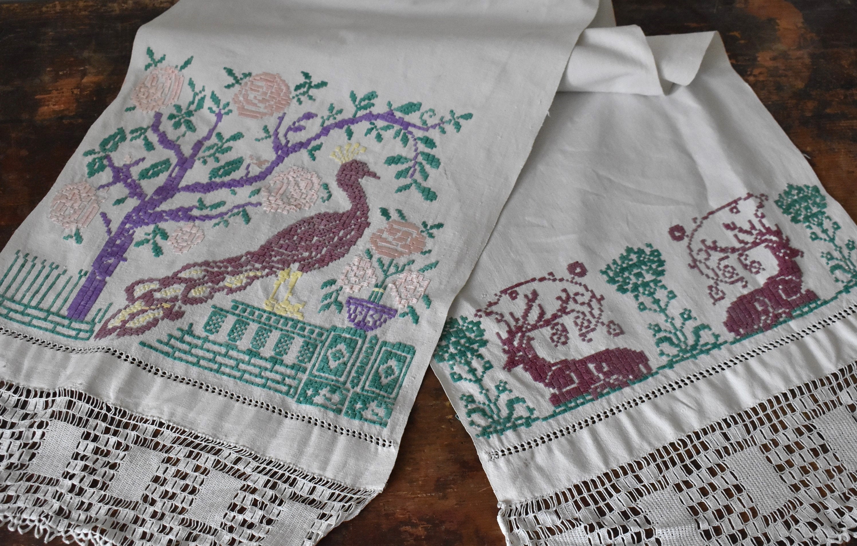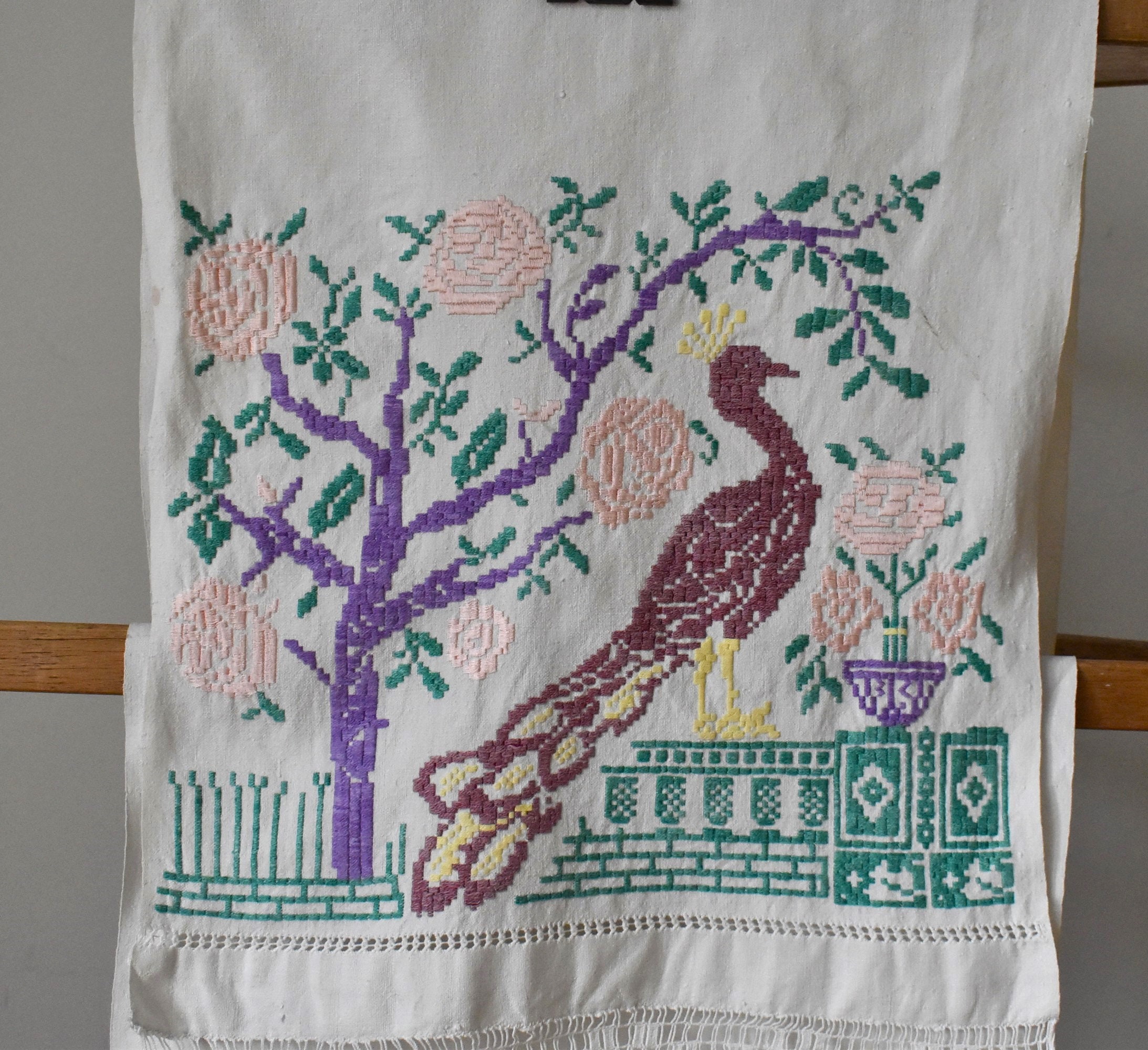 Designed to be hung folded over a rail so that both embroidered ends are displayed
