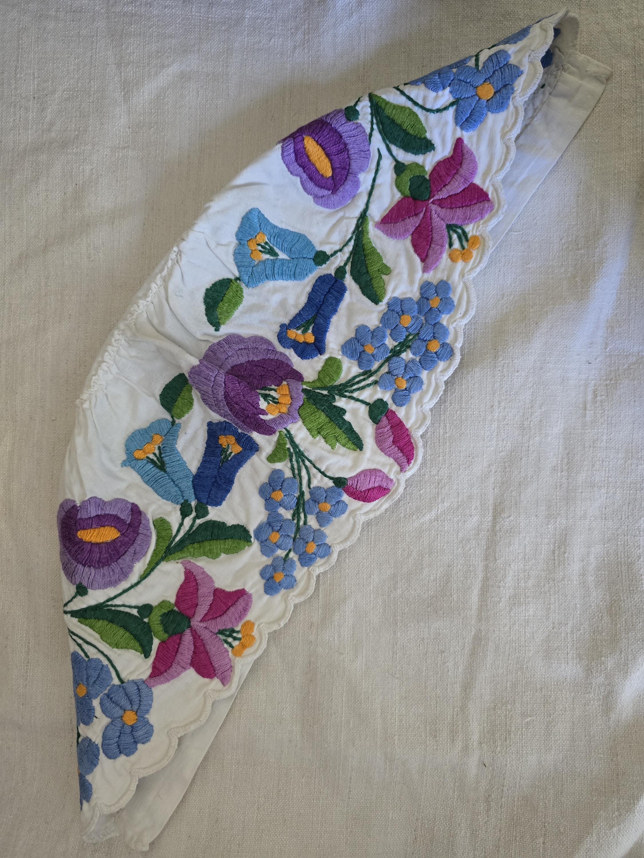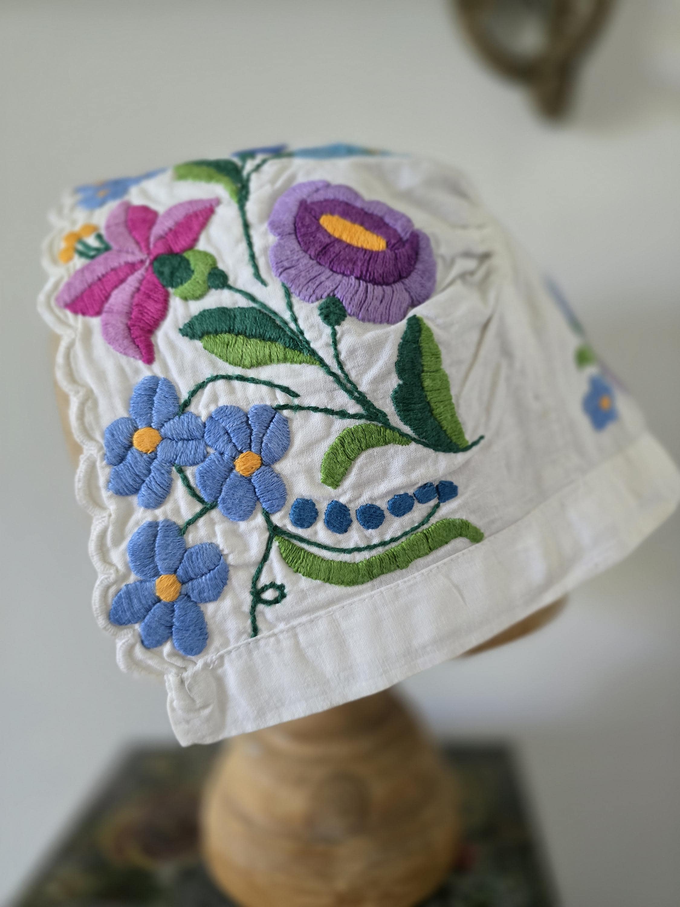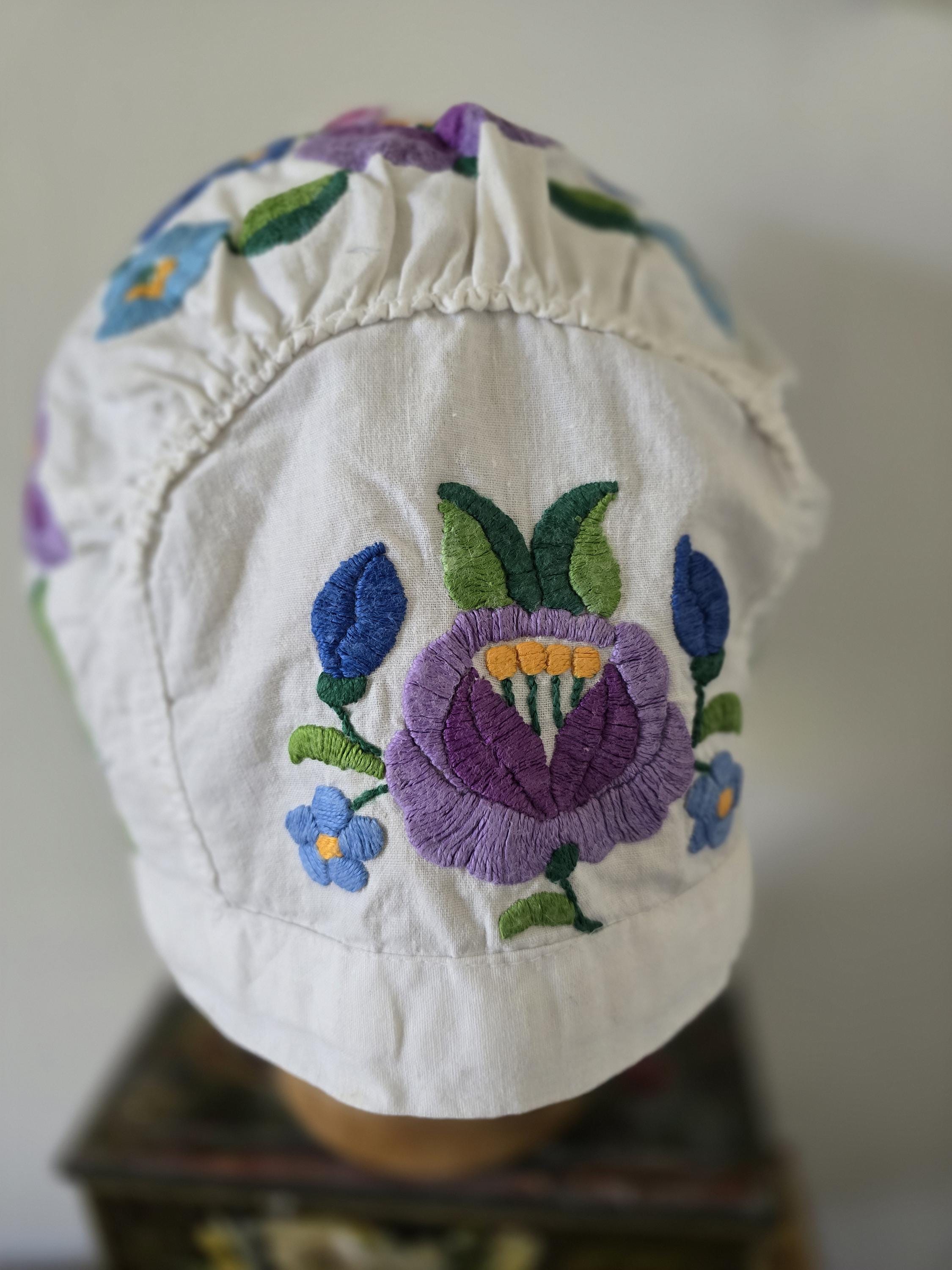A reallly pretty embroidered Hungarian (Kalocsa)bonnet. Adult sizeIn good condition. approx 82 cm circumferenceFollow me on instsgram for updates on tours, textiles and travel @folktextilea_parna @parnaramarama