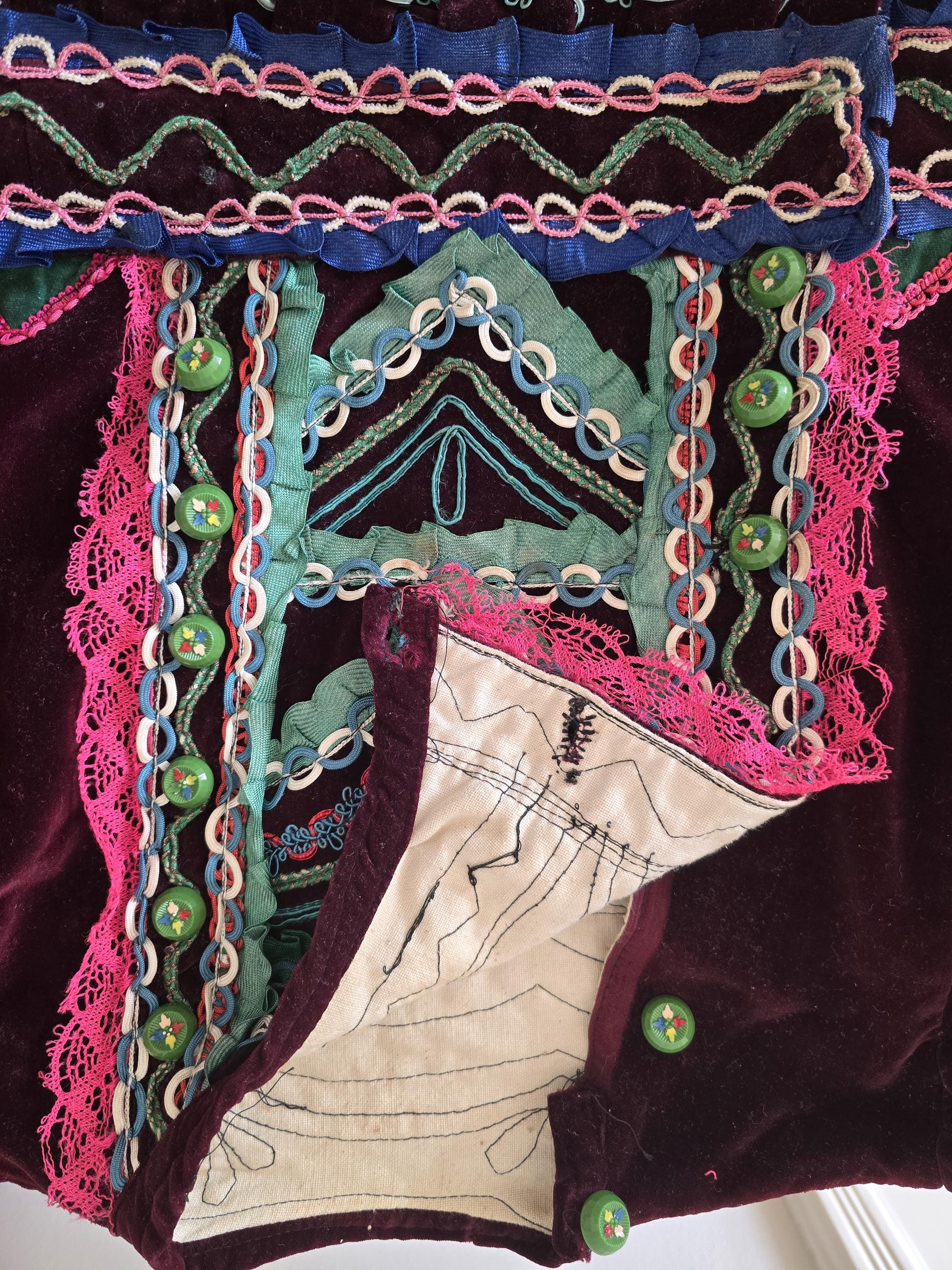 Not laundered, dry cleaning recommended. In good condition. Some damage to the pink lace bordering the button strip. Some marks on the lining and some marks on aomw of the green trim which may remove with cleaning