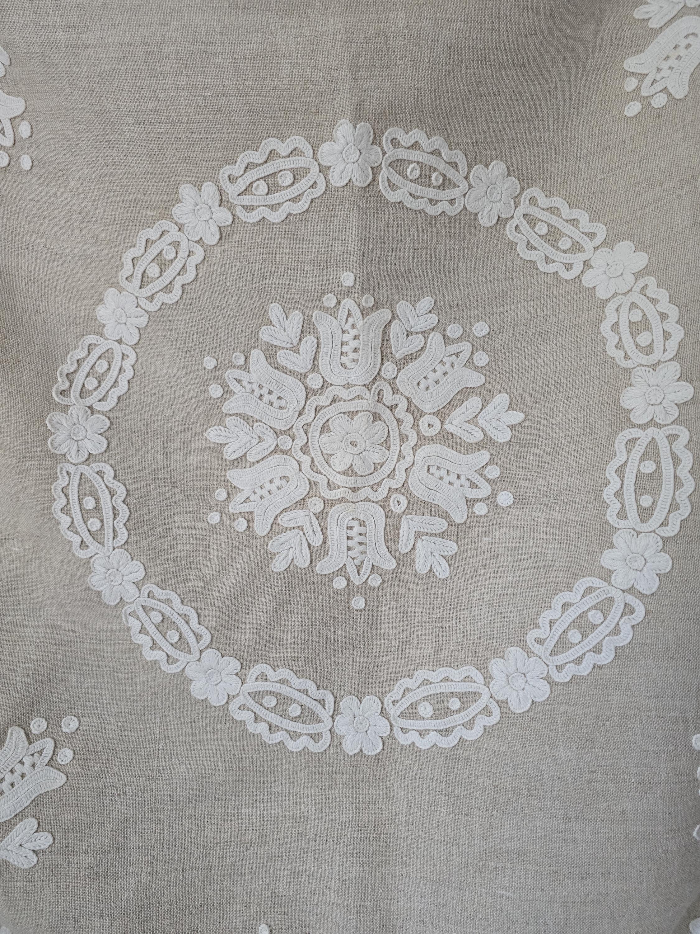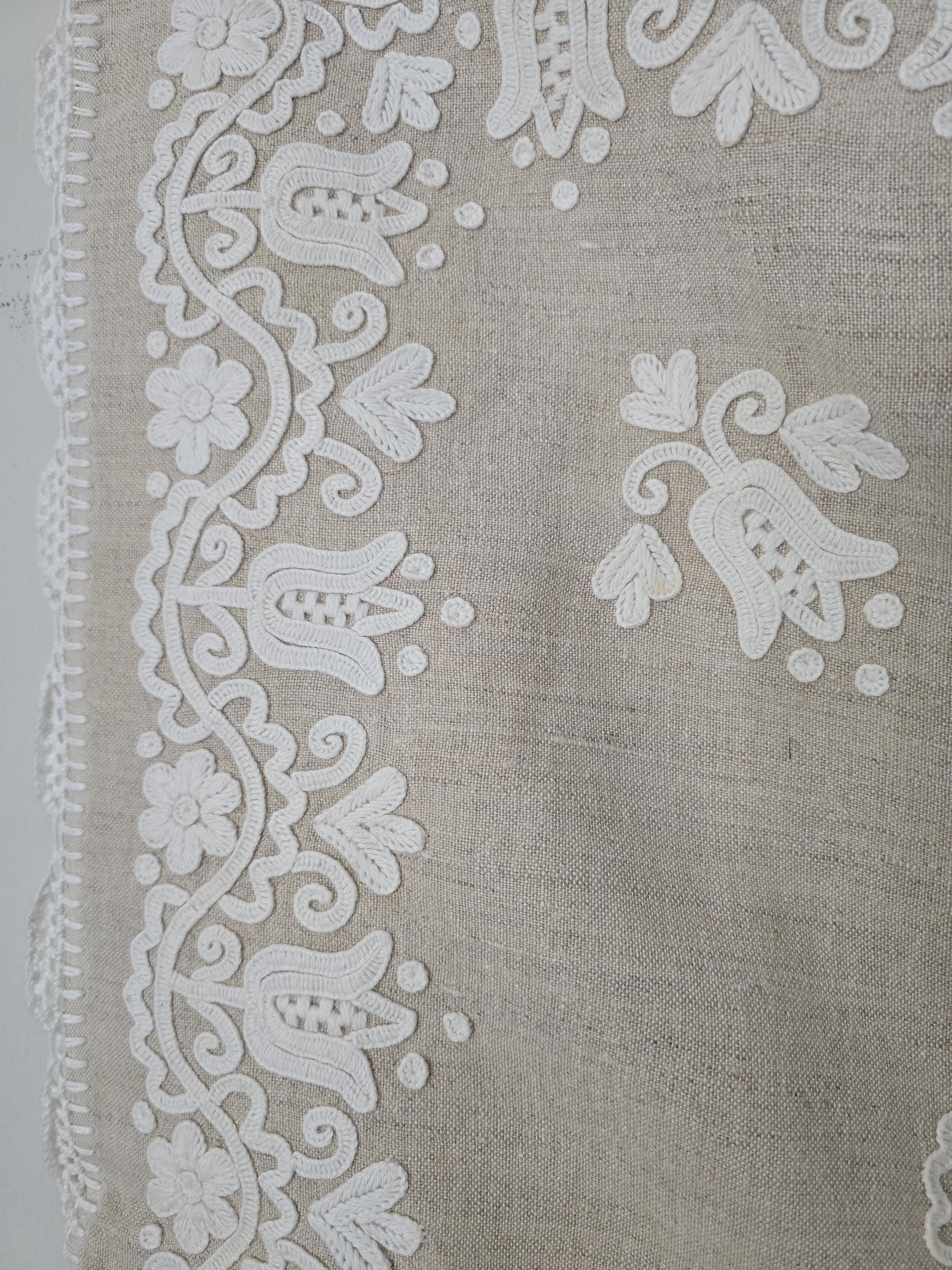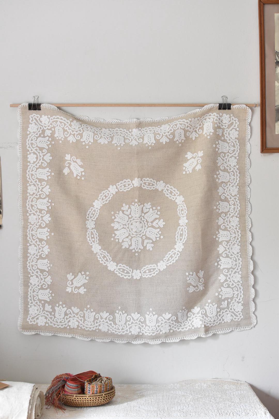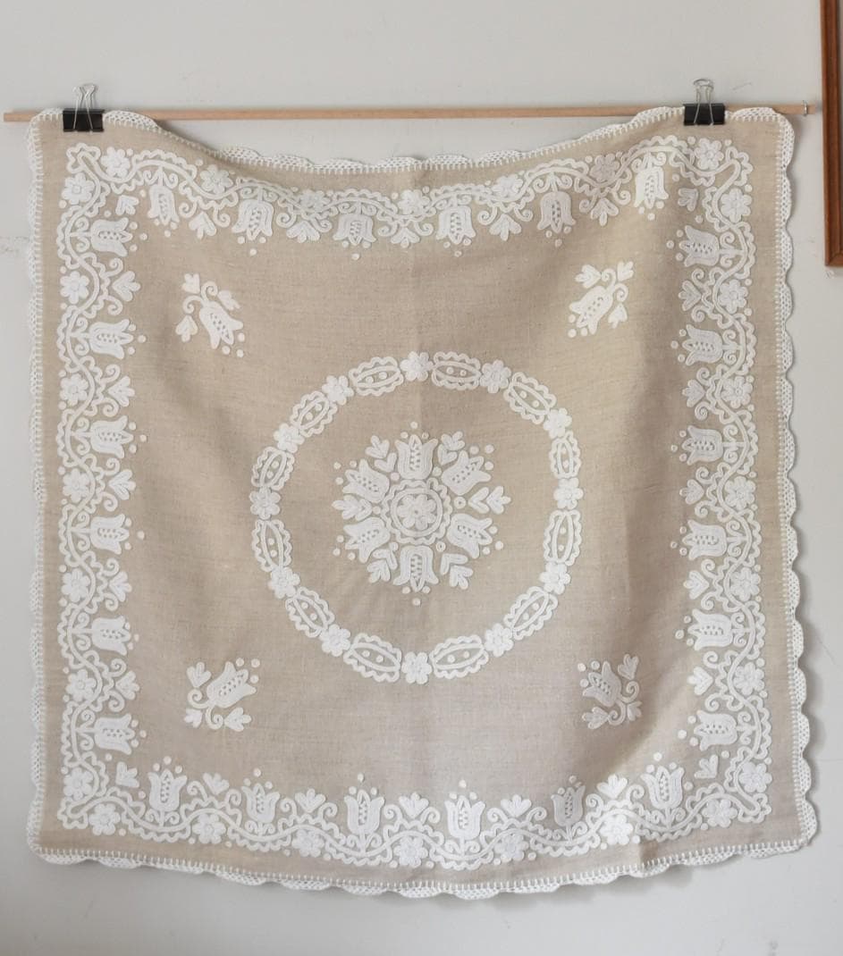 Vintage embroidered table cloth from the Kalotaszeg region of Transylvania.Embroidered by hand using open chain stitch on a linen clothLaundered and in excellent condition 100 x 98cm Handmade crochet lace surround