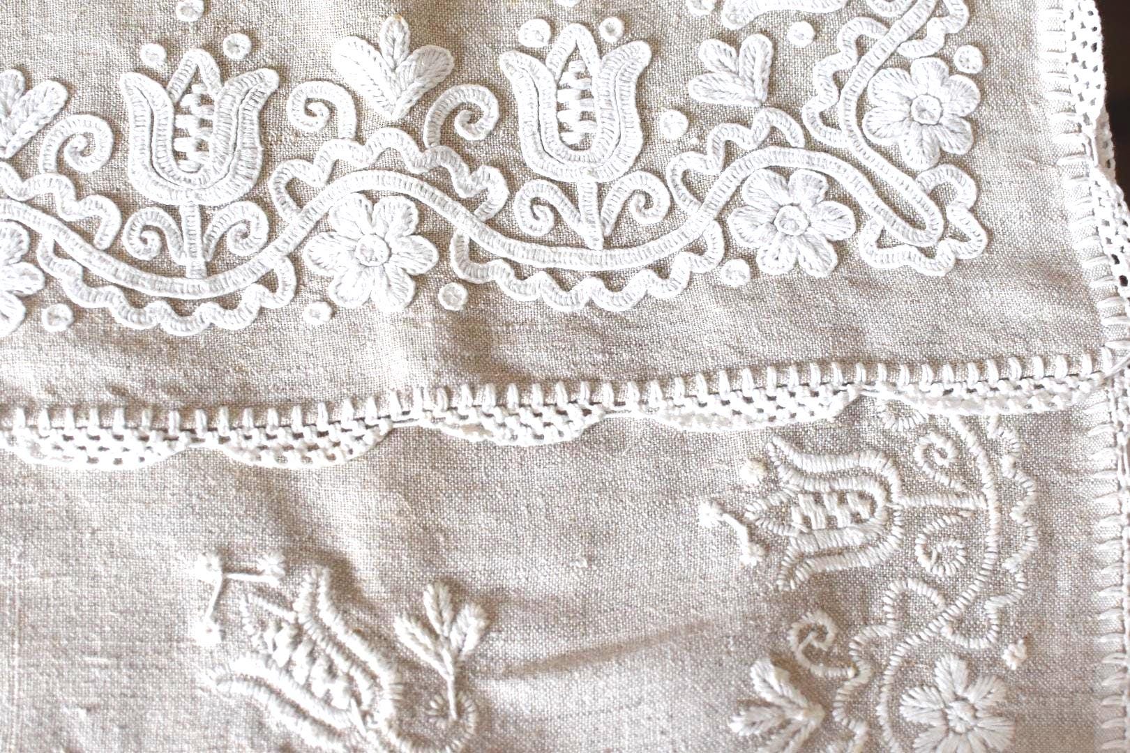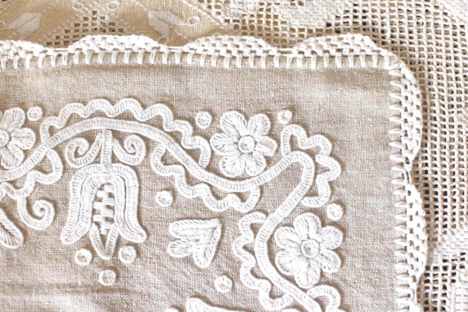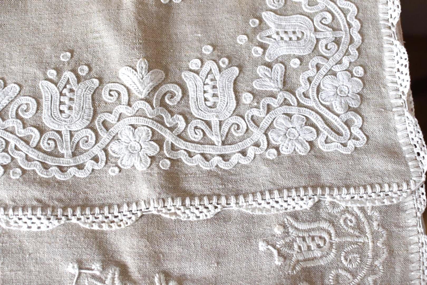Vintage embroidered table cloth from the Kalotaszeg region of Transylvania.Embroidered by hand using open chain stitch on a linen clothLaundered and in excellent condition 100 x 98cm Handmade crochet lace surround