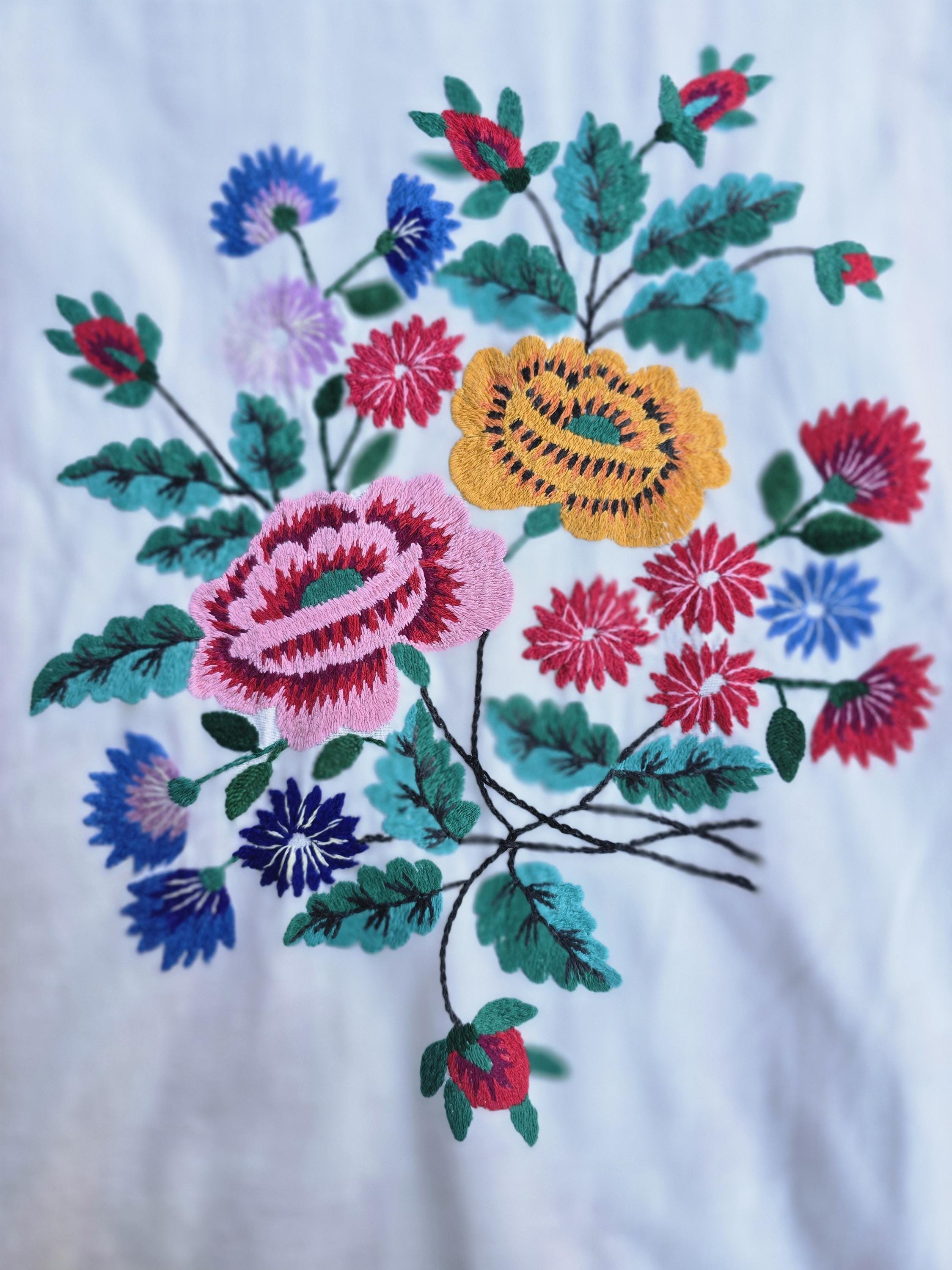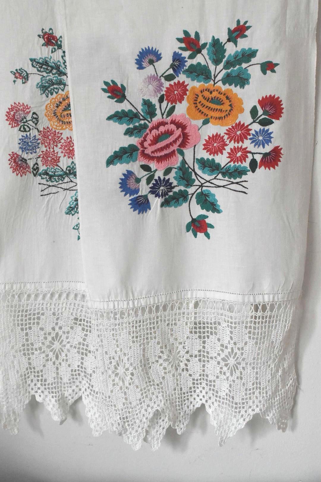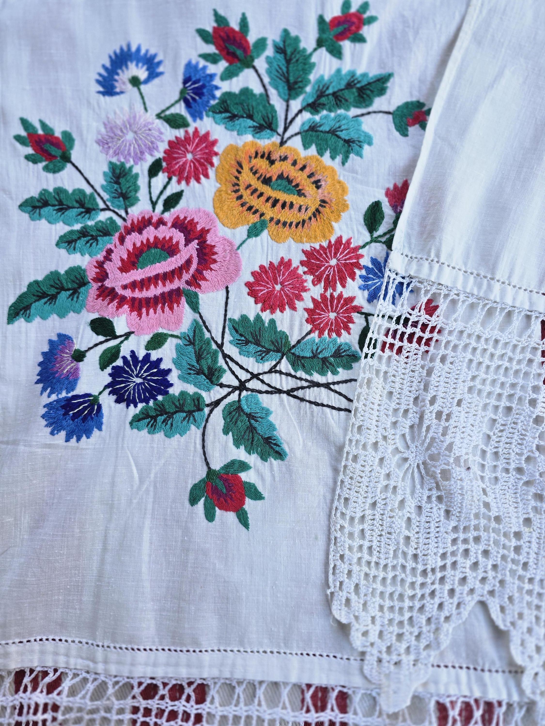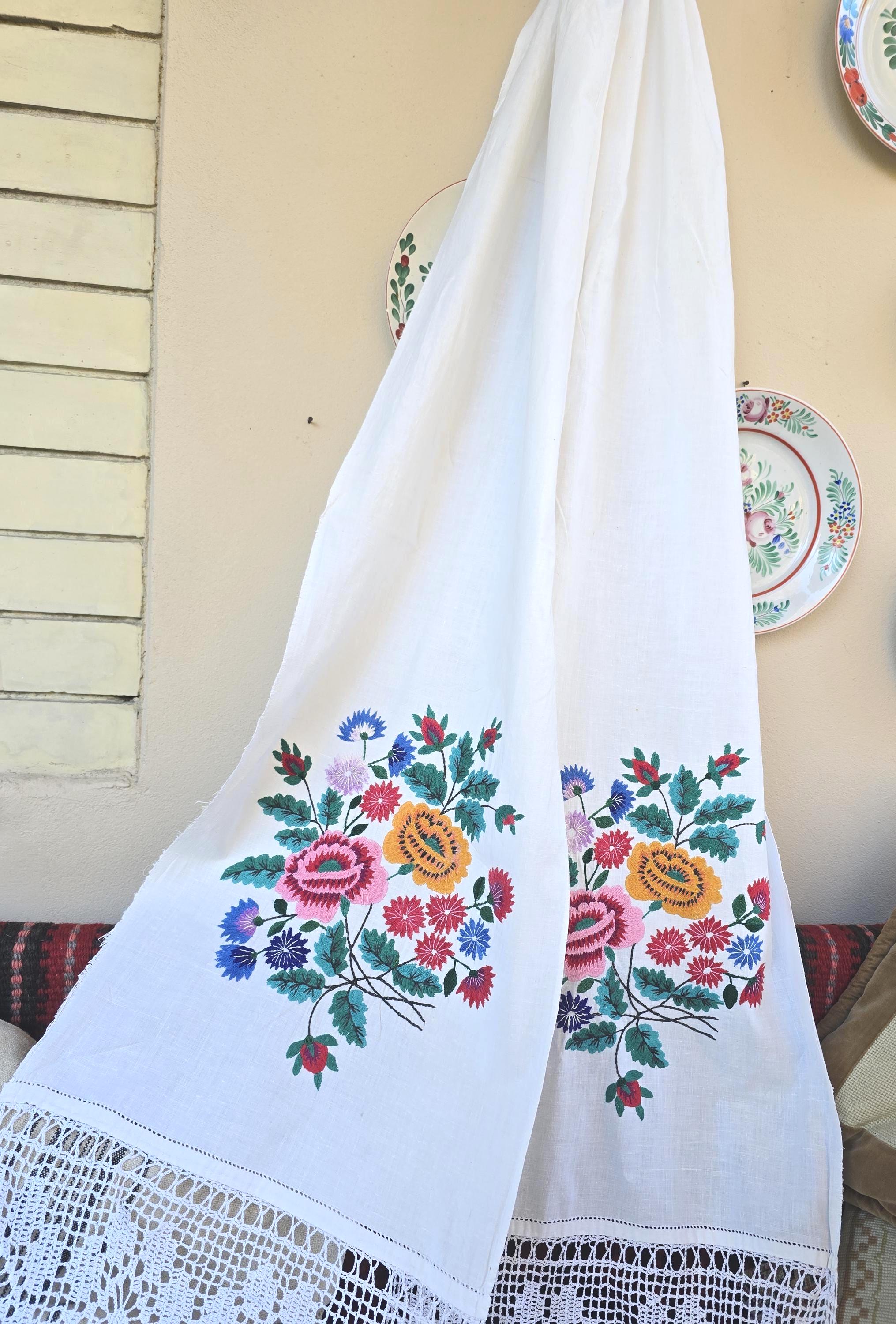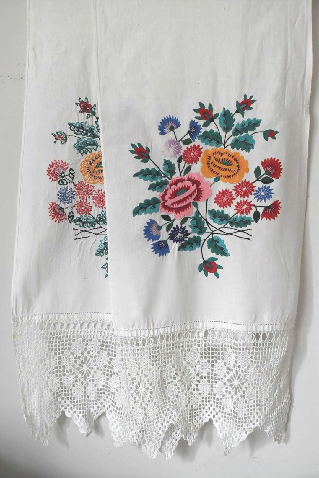 Bright and beautiful vintage embroidered cloth from Northern Romania.Embroidered on a cotton cloth Crocheted lace trimLaundered and in excellent conditionOverall length 250cm plus laceWidth 39cmEmbroider height 31cm