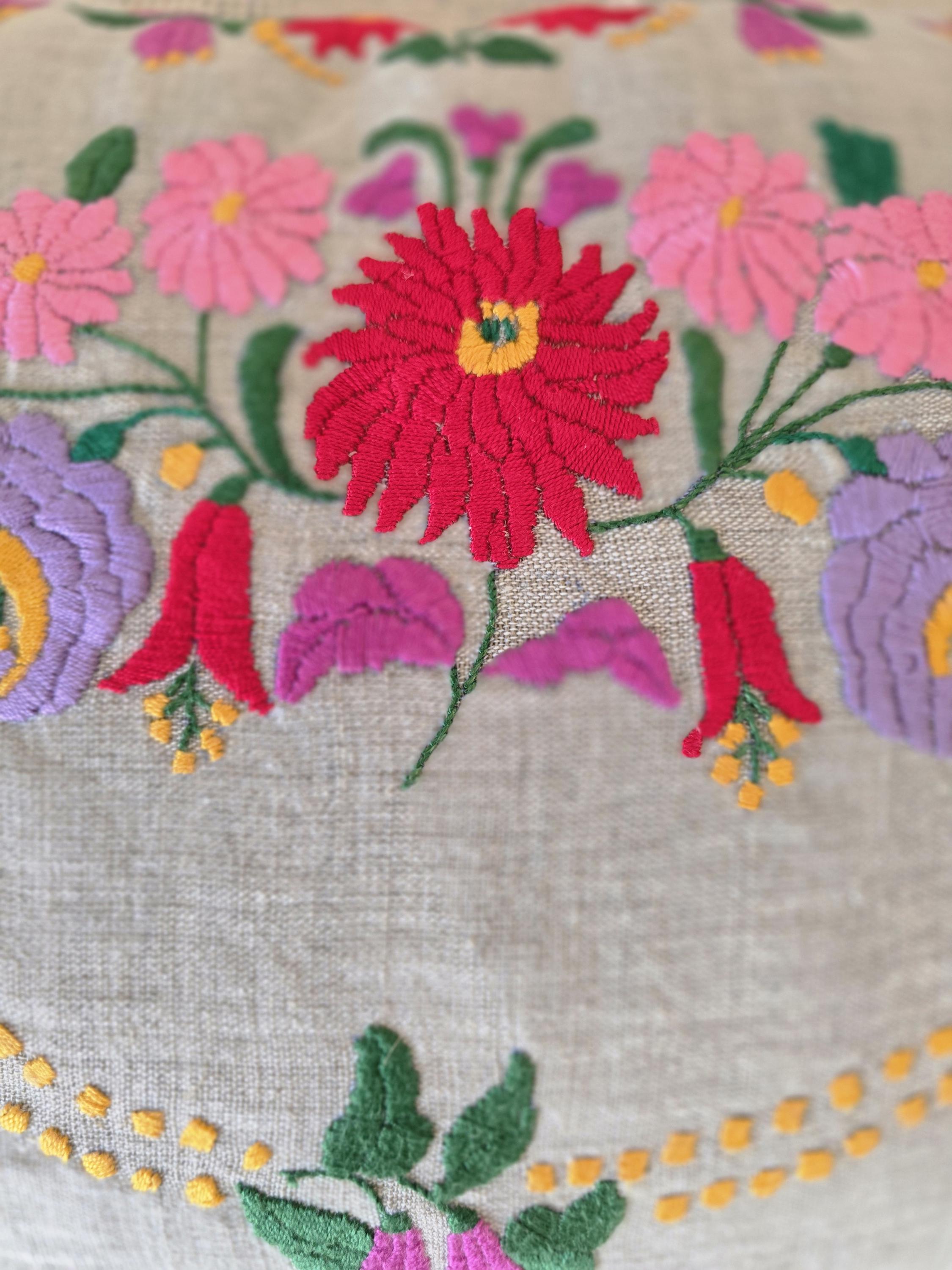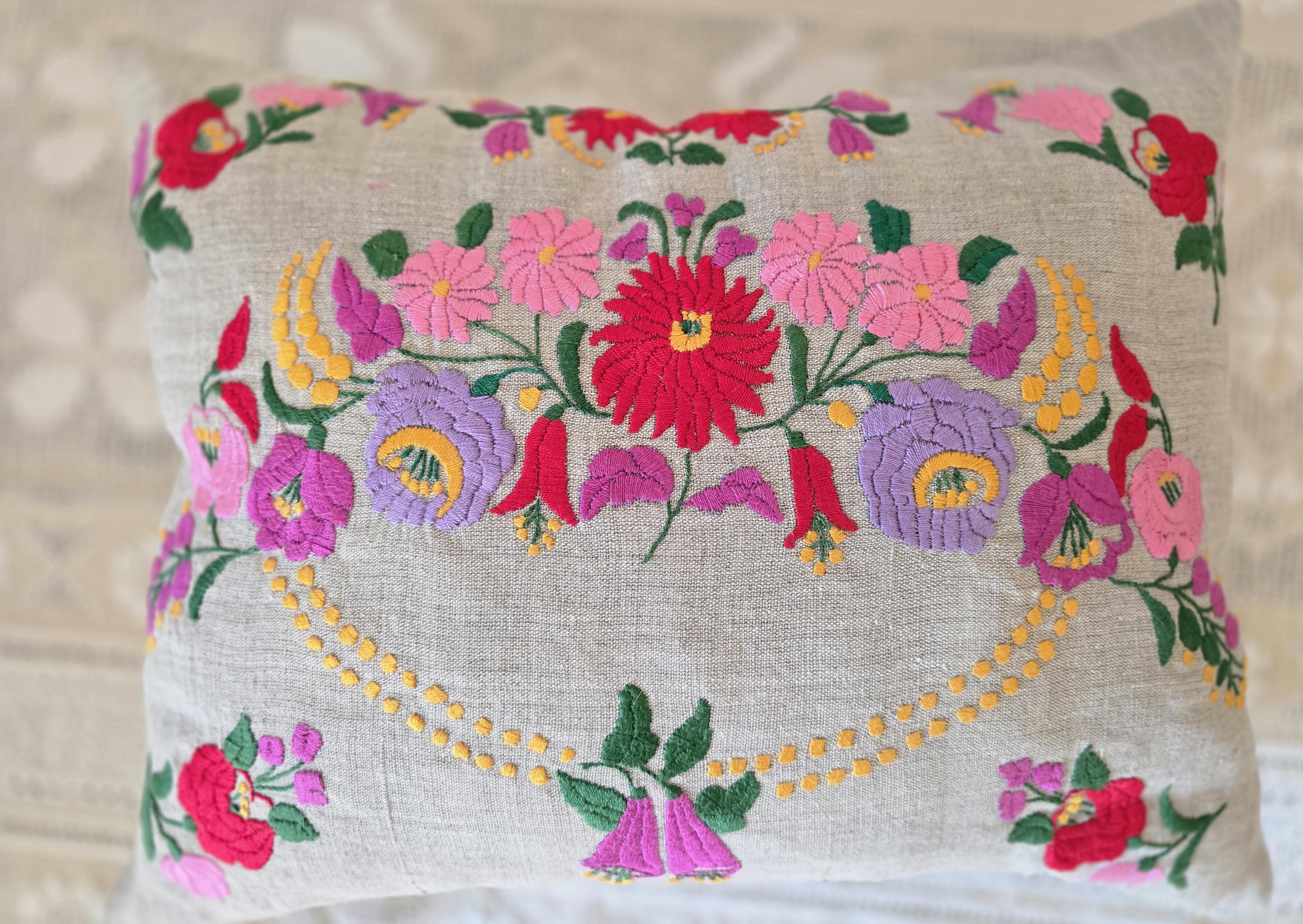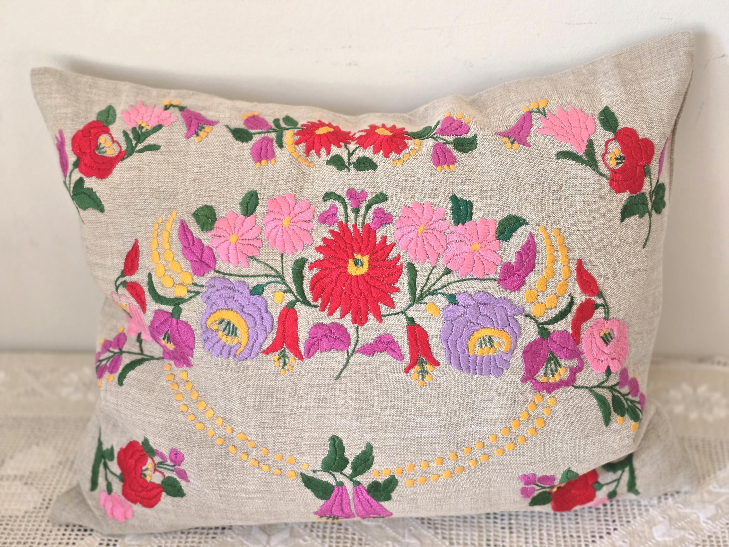 Another very pretty Matyo cushion cover. Pretty colours.on a home loomed linen cloth.