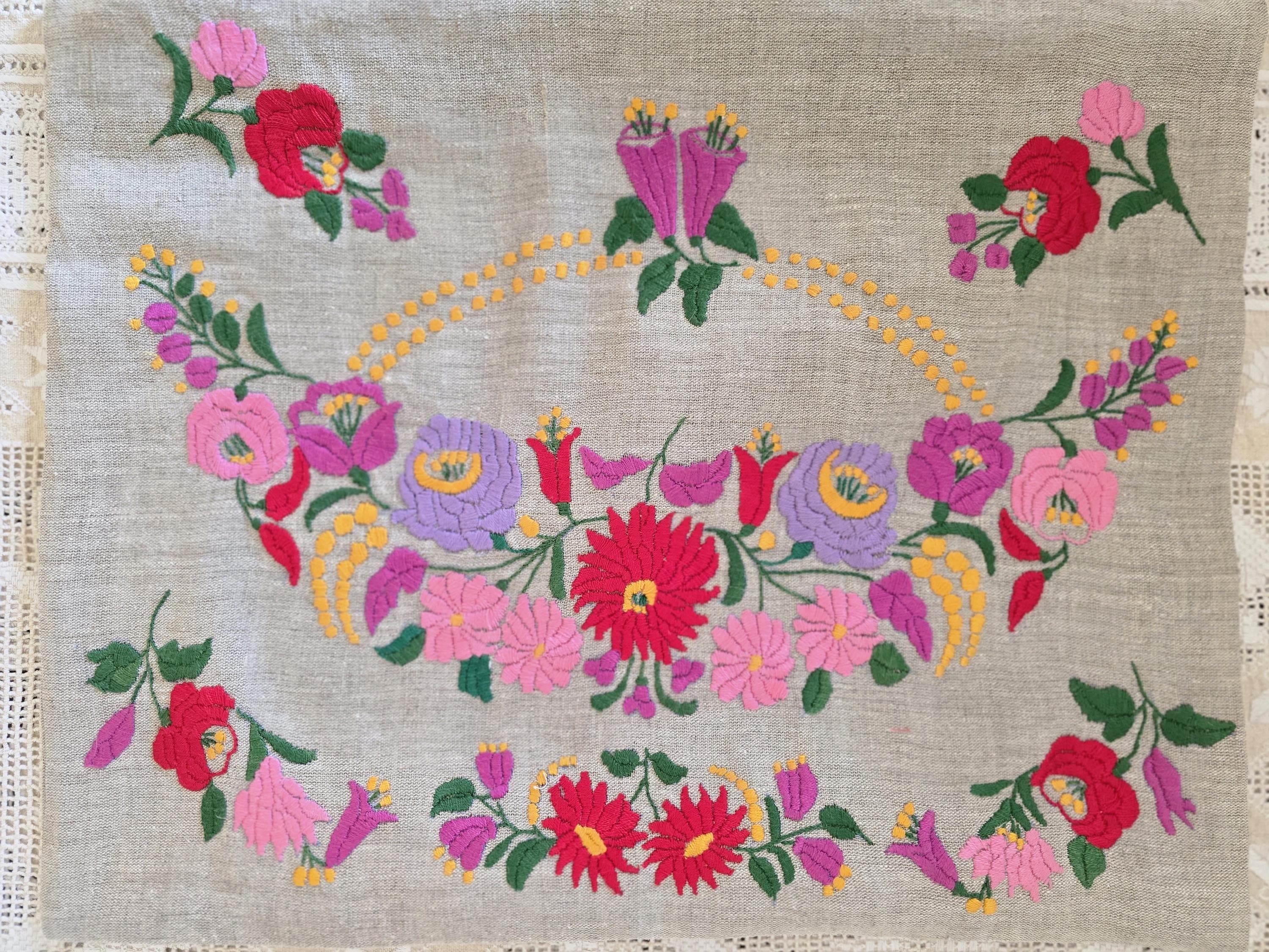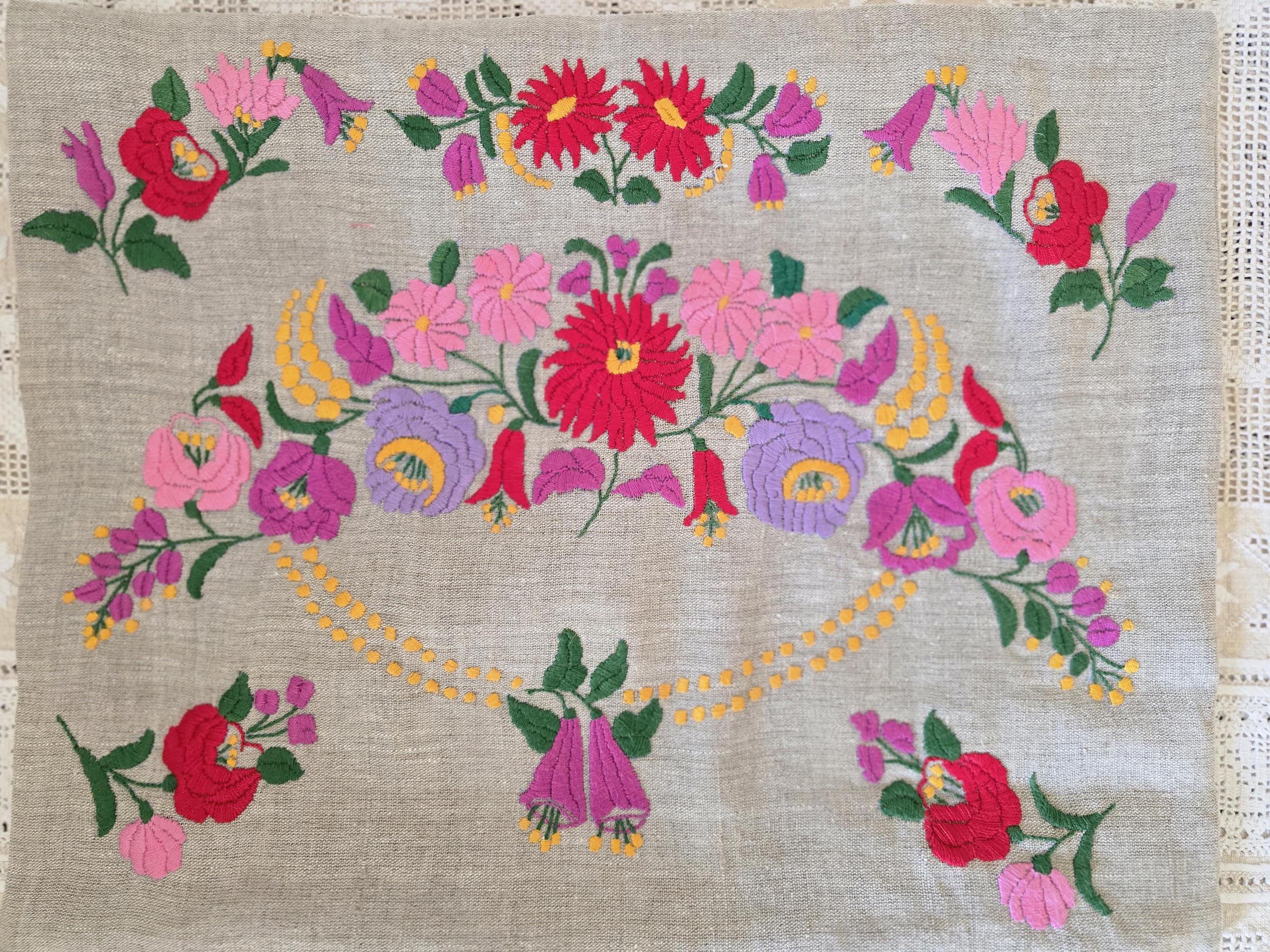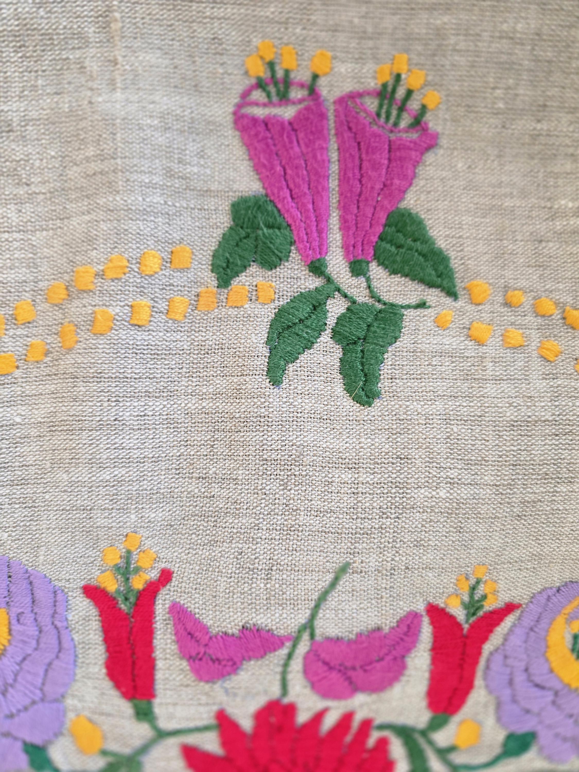 Another very pretty Matyo cushion cover. Pretty colours.on a home loomed linen cloth.