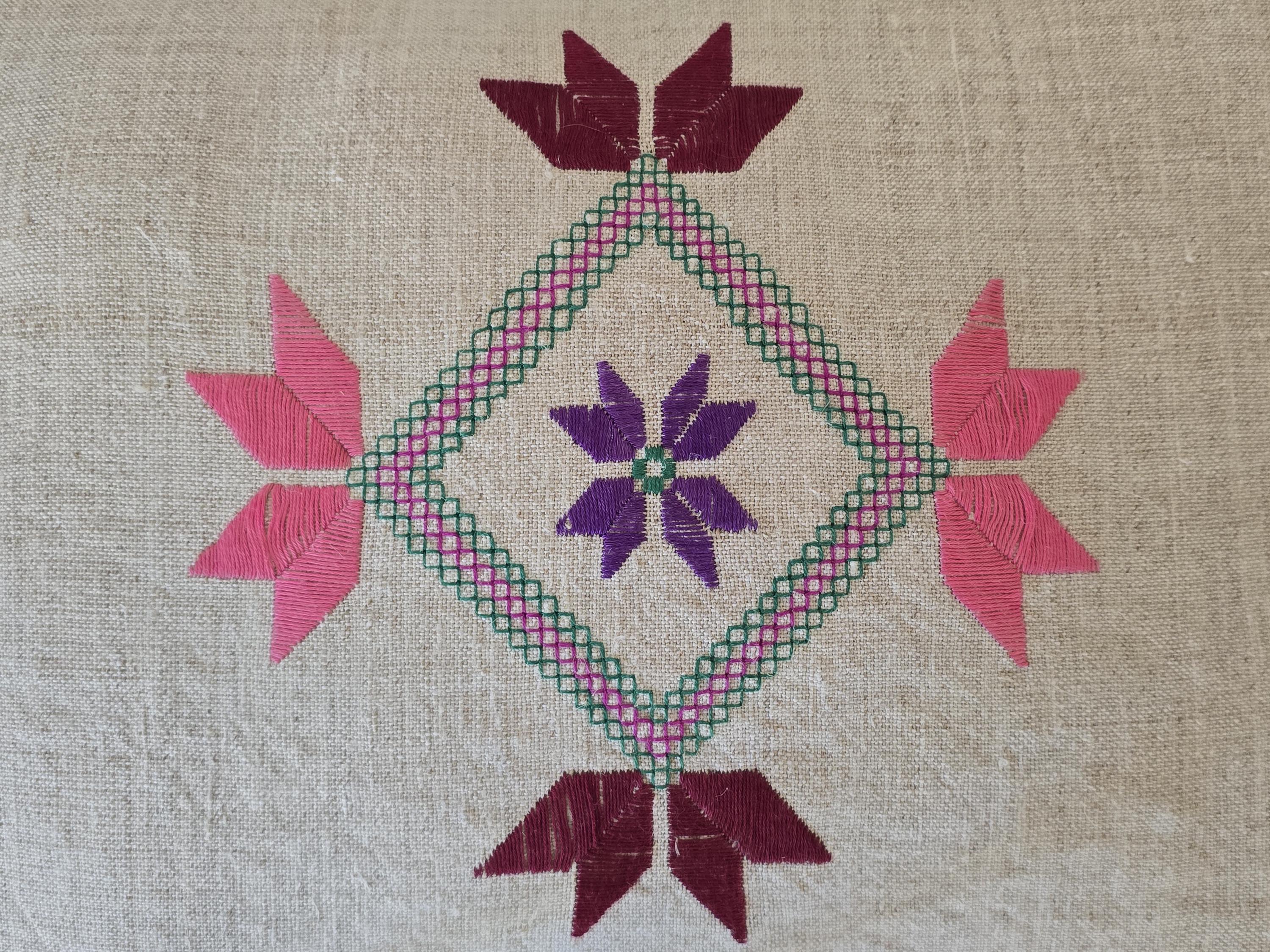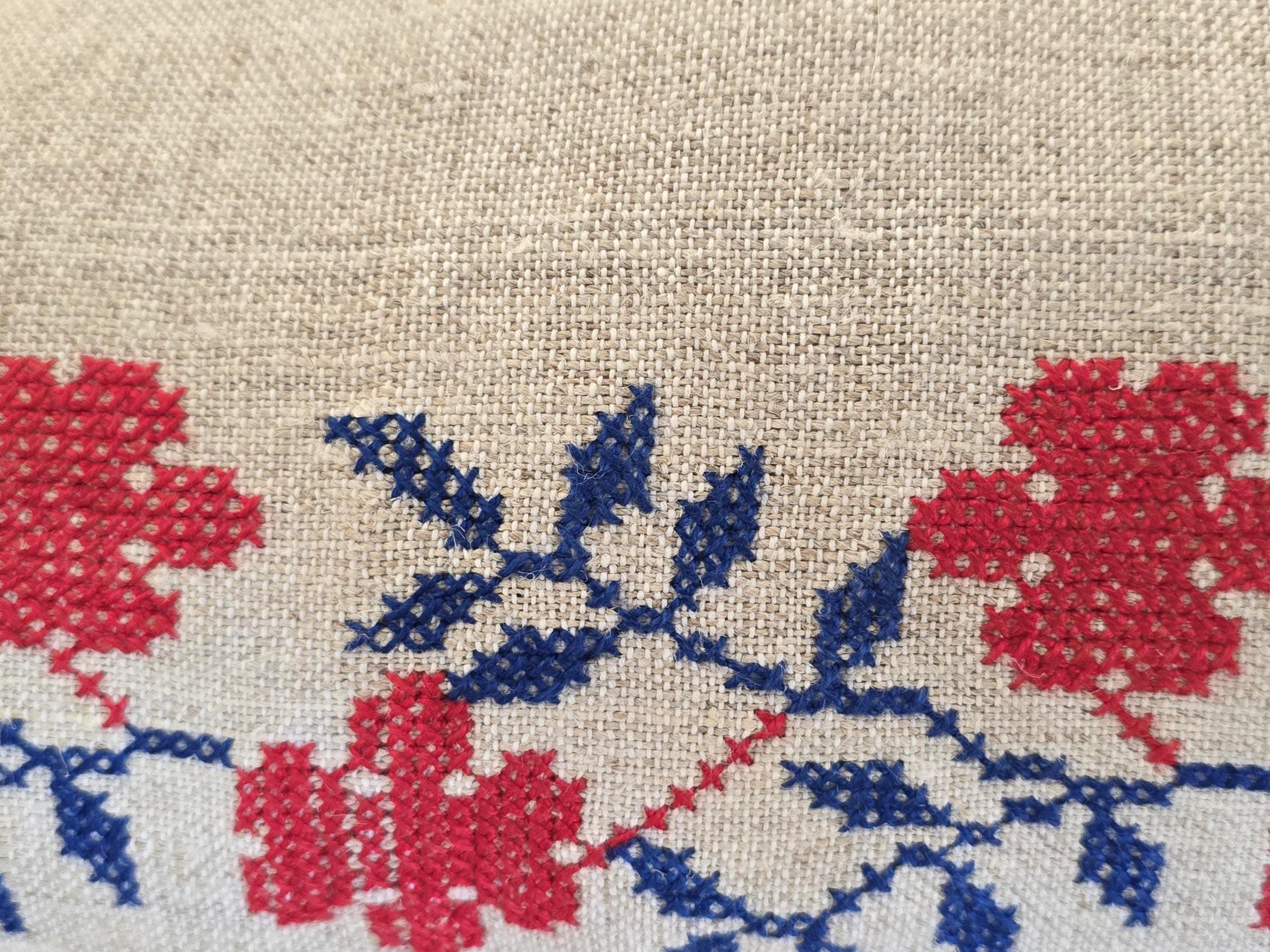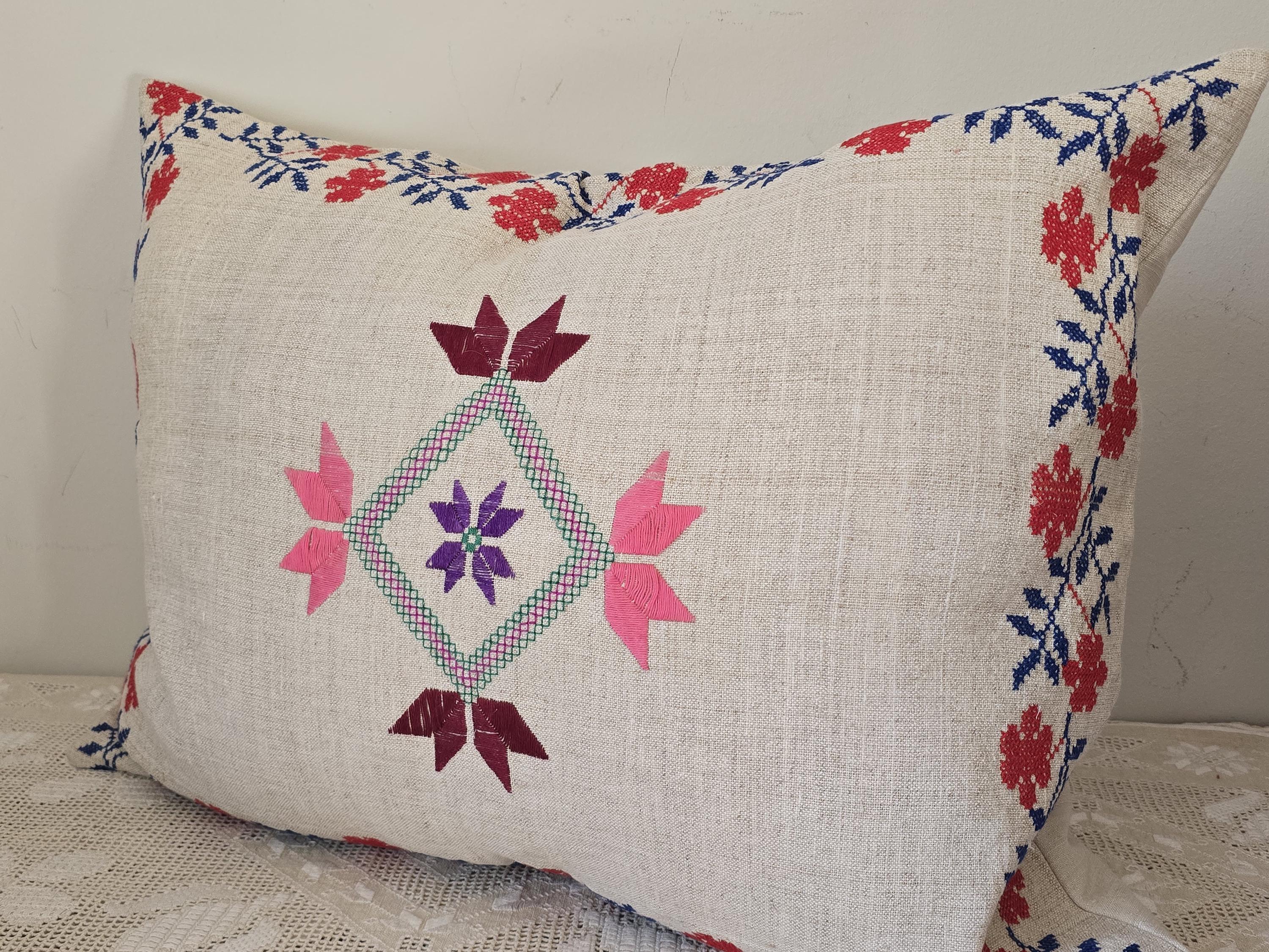 Large cushion cover from pretty vintage Hungarian embroidery. Hand - embroidered on a home- loomed hemp cloth. Border of cross -stitched roses and a central geometric design.