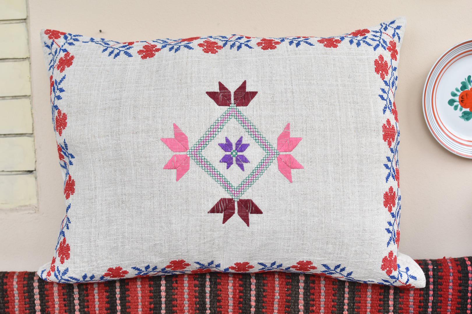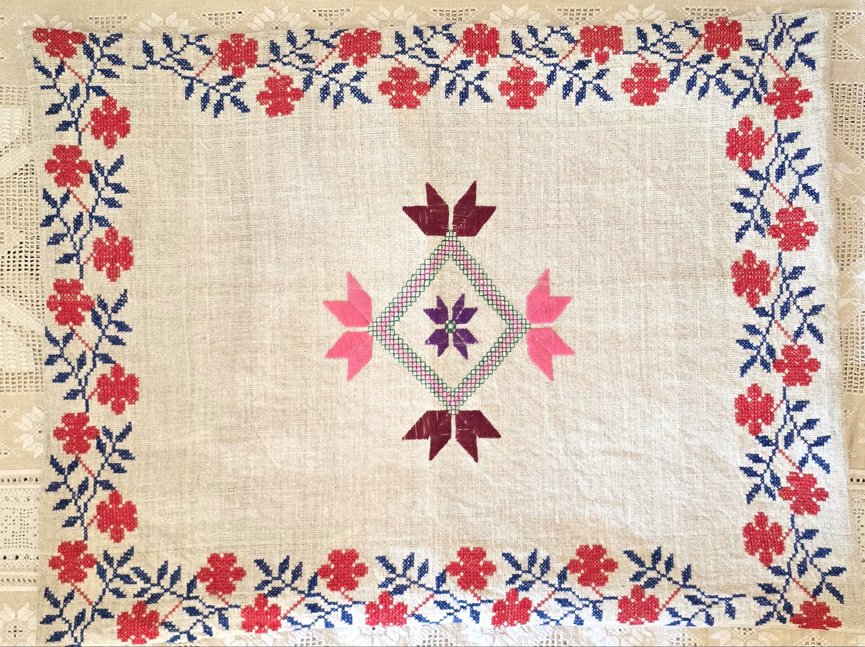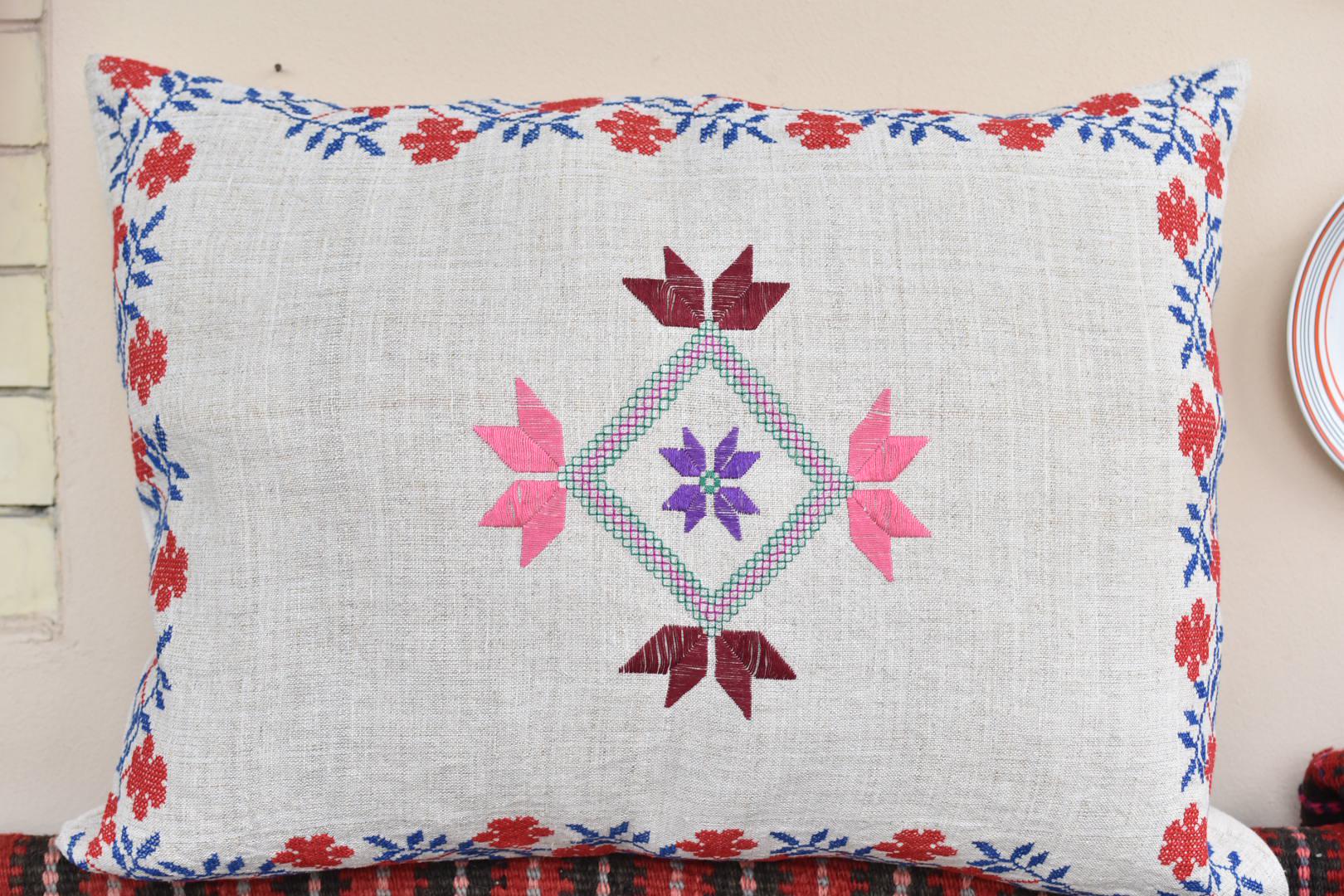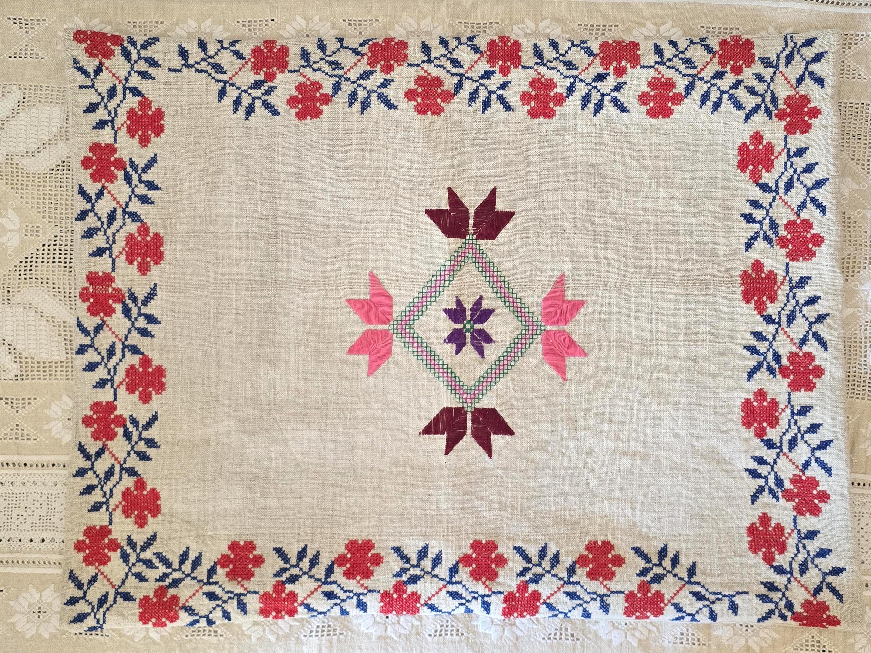 Large cushion cover from pretty vintage Hungarian embroidery. Hand - embroidered on a home- loomed hemp cloth. Border of cross -stitched roses and a central geometric design.