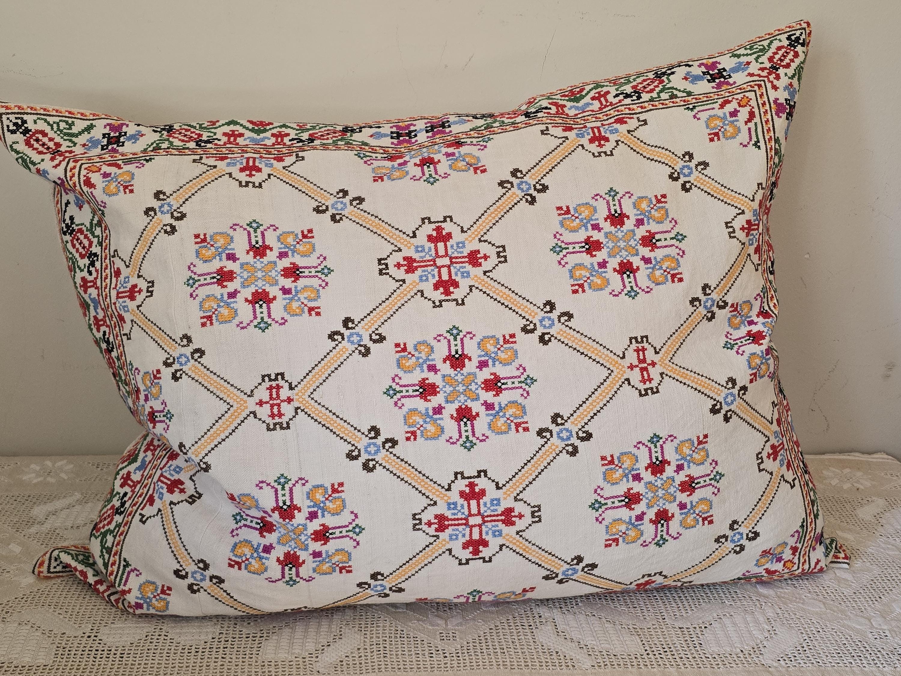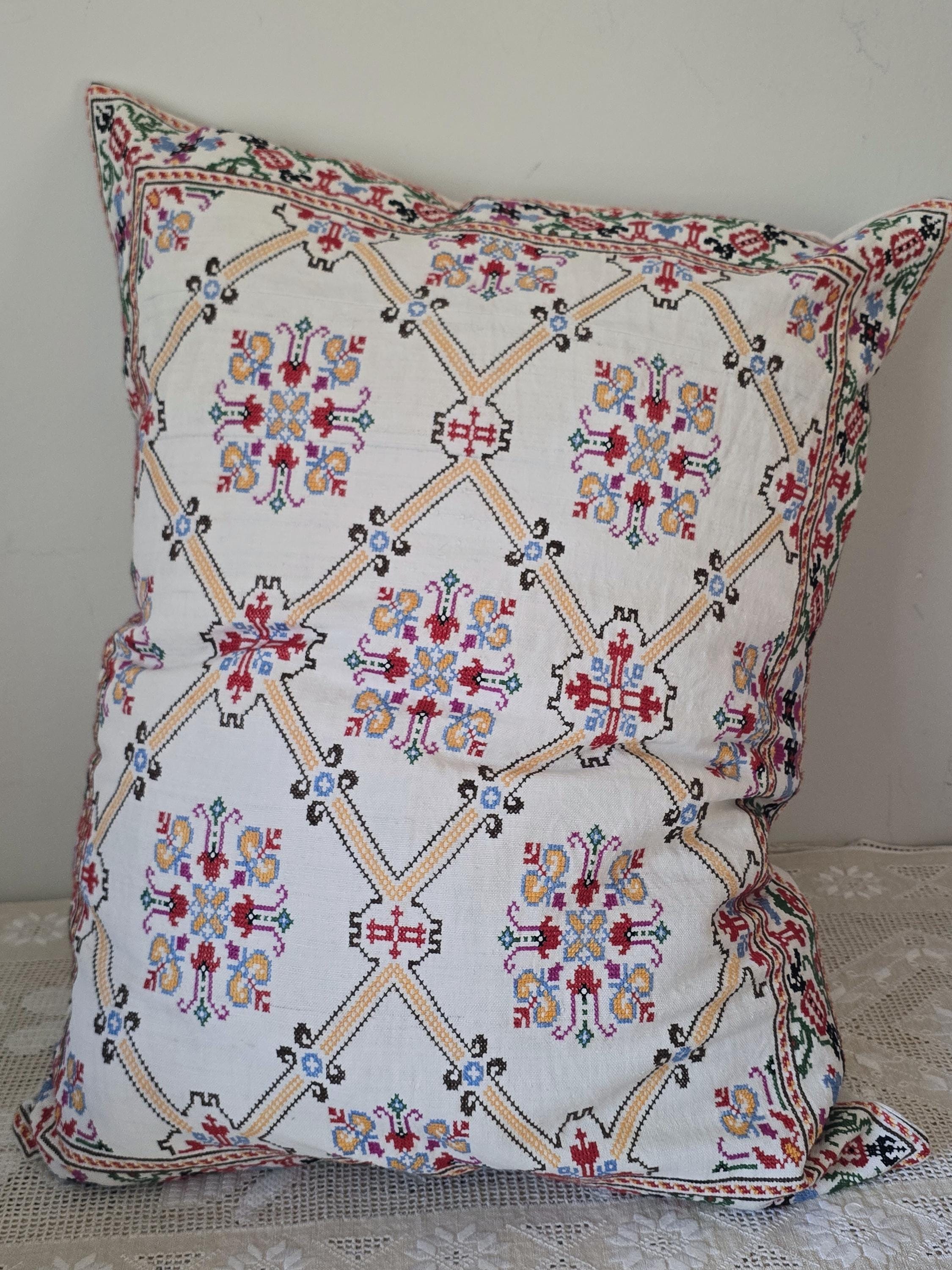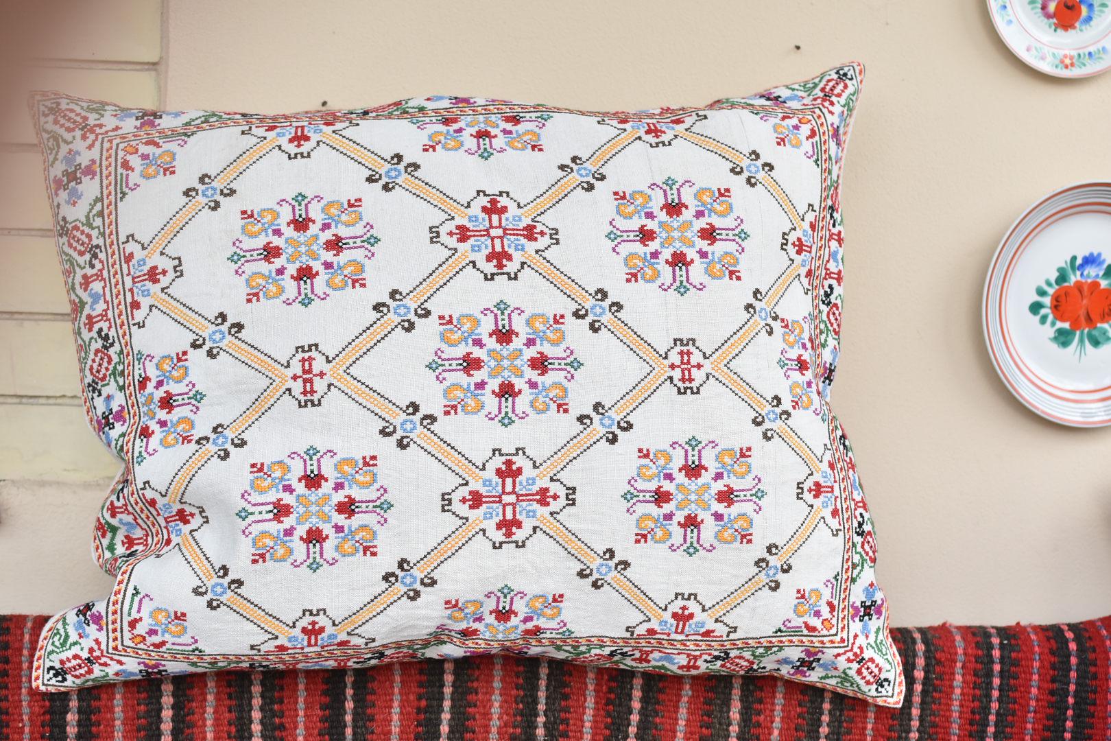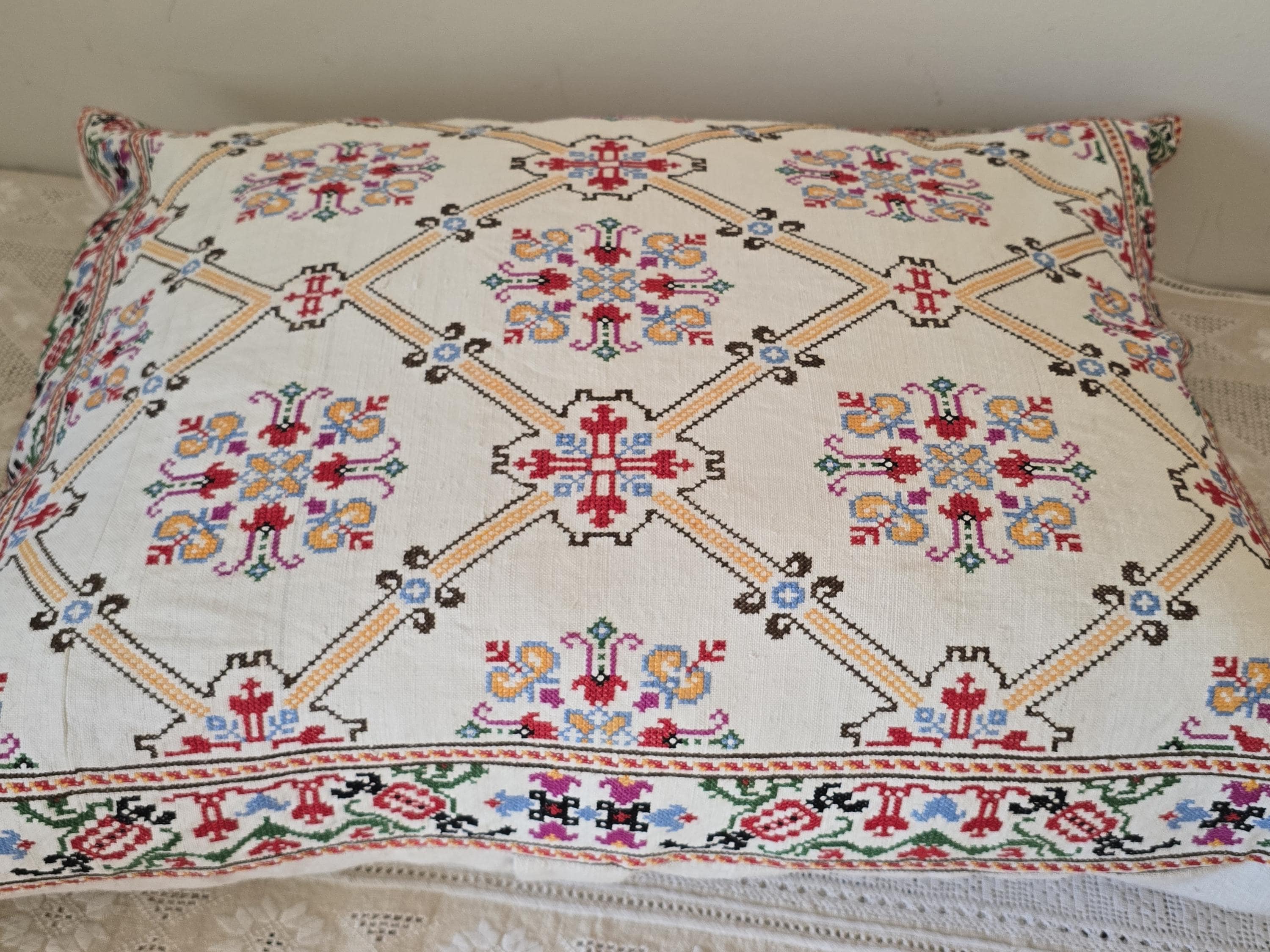Cushion from Antique embroidery. Embroidered in cross-stitch on a home -loomed cloth. There is a seam in the cloth. Very pretty and in excellent condition