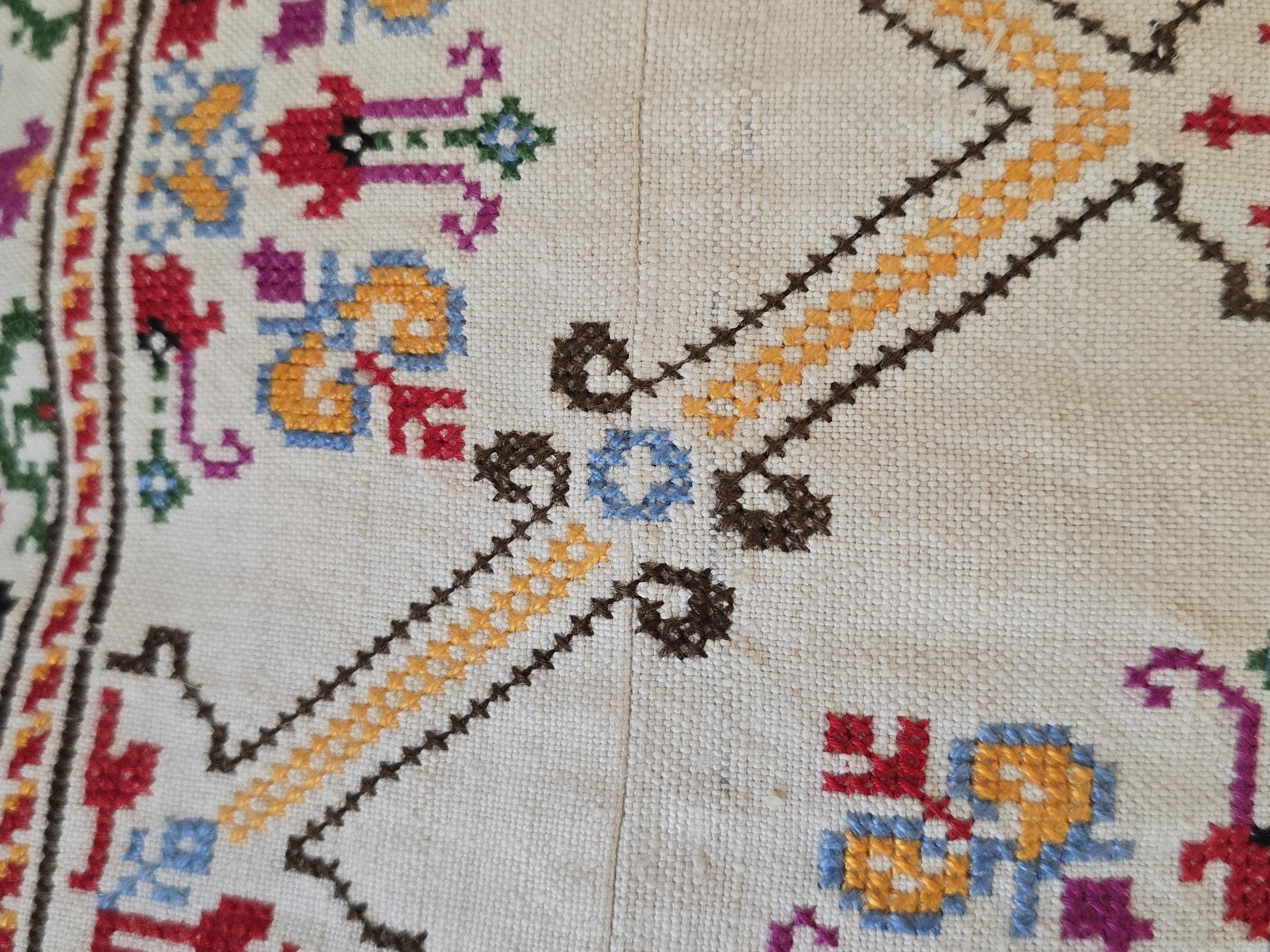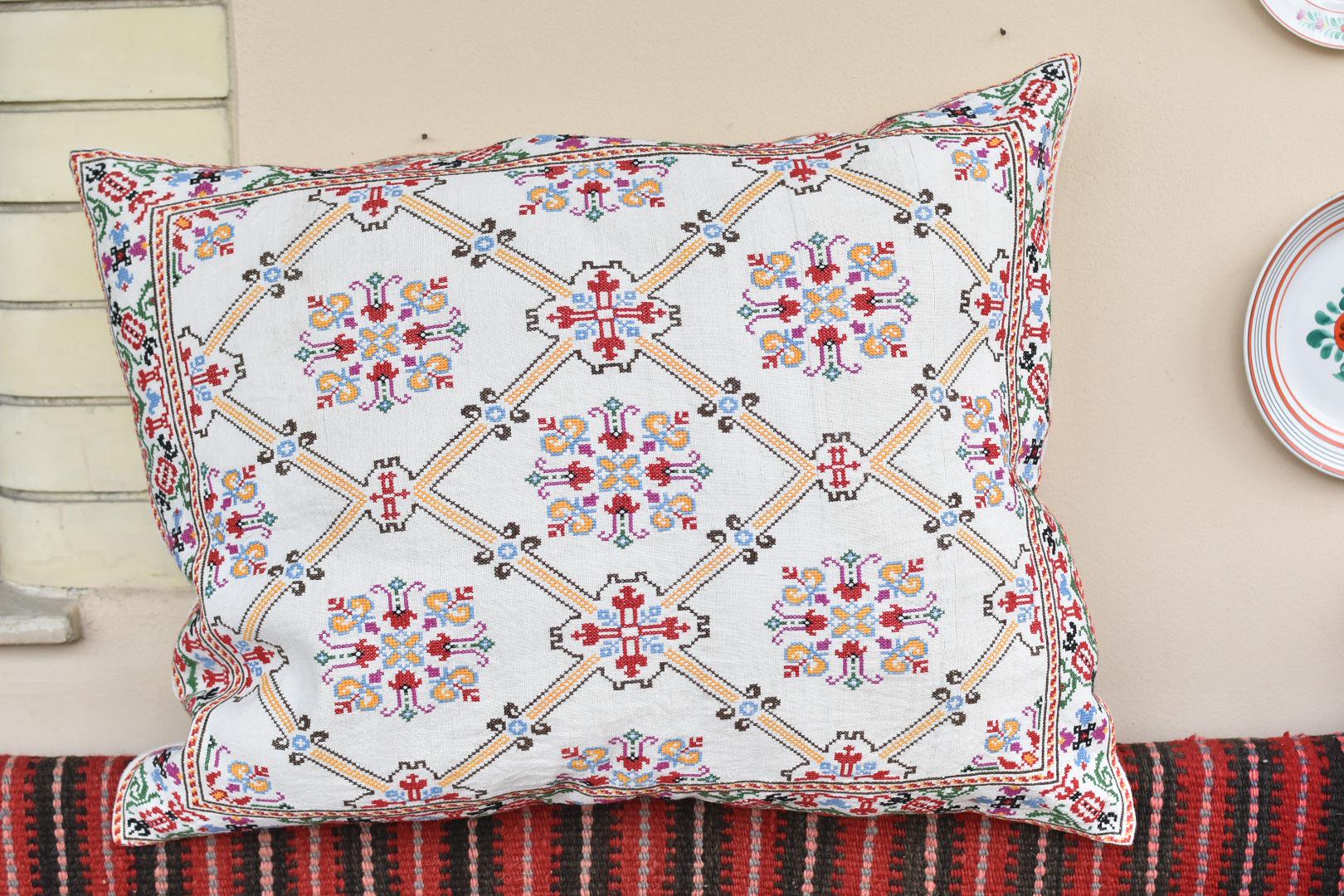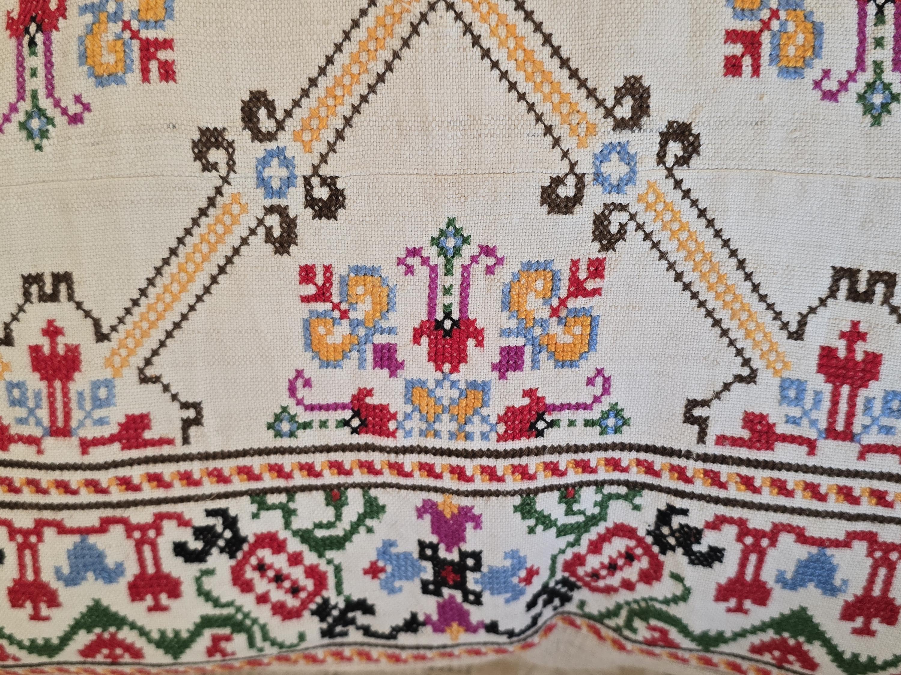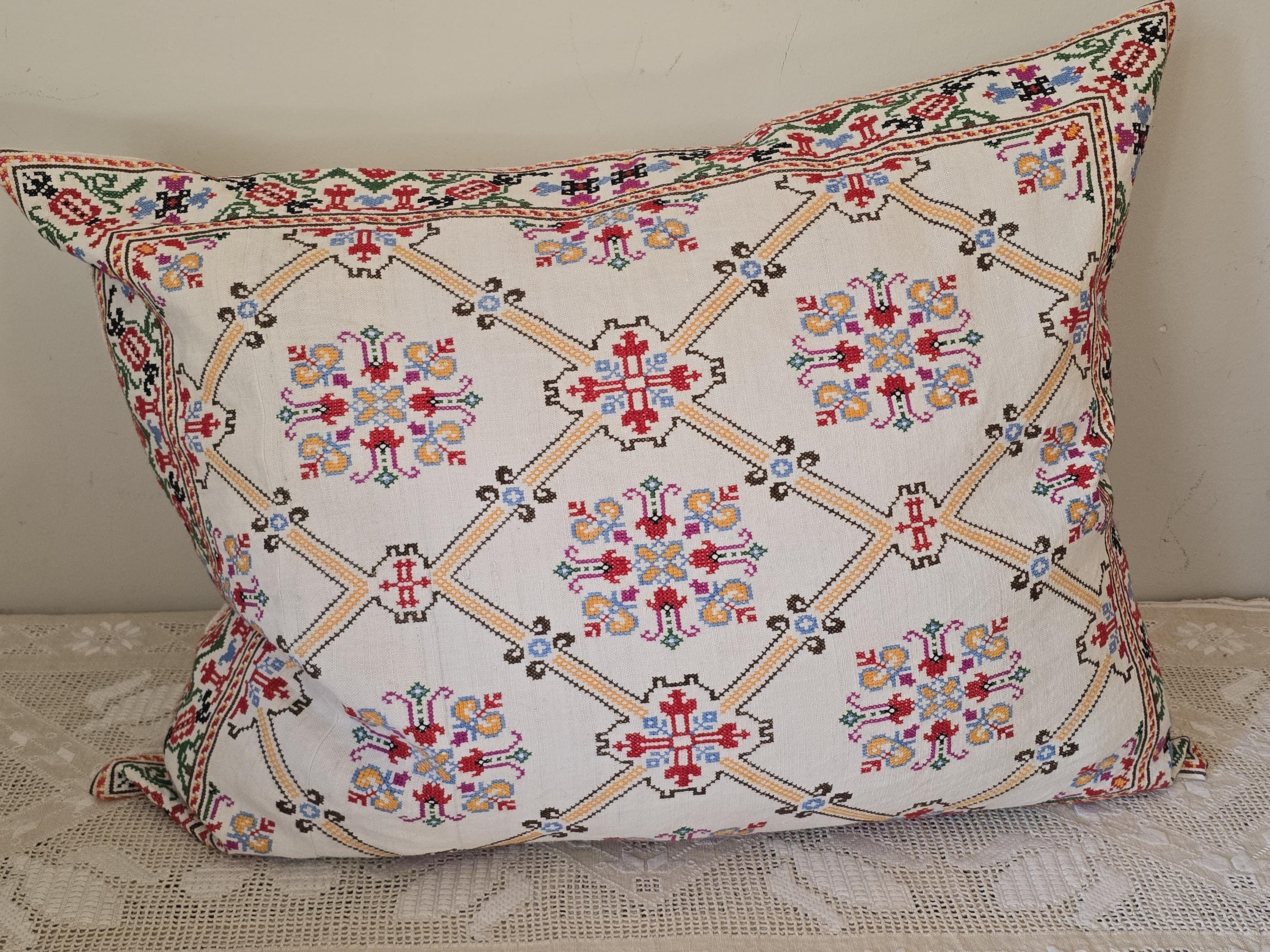 Cushion from Antique embroidery. Embroidered in cross-stitch on a home -loomed cloth. There is a seam in the cloth. Very pretty and in excellent condition