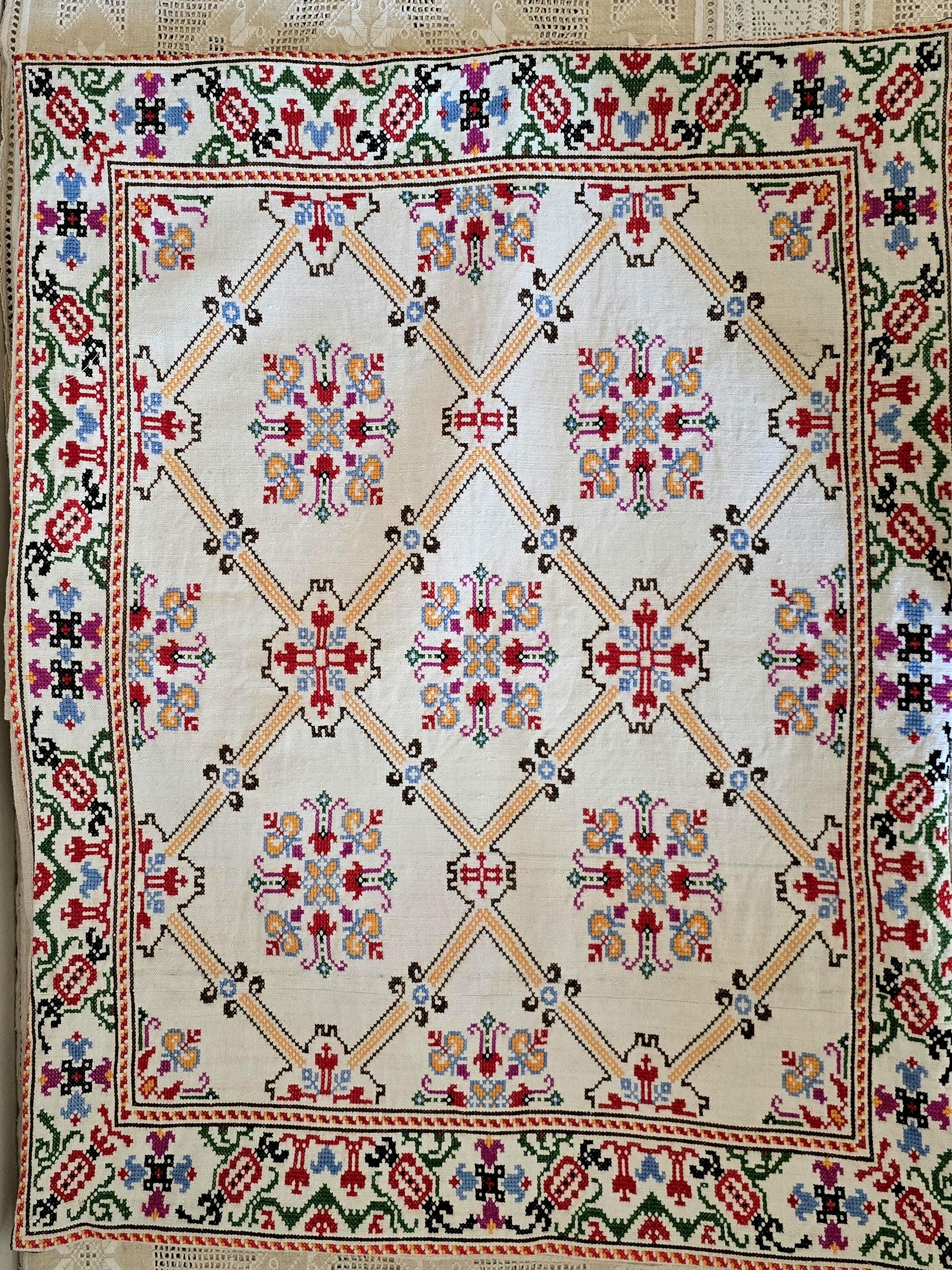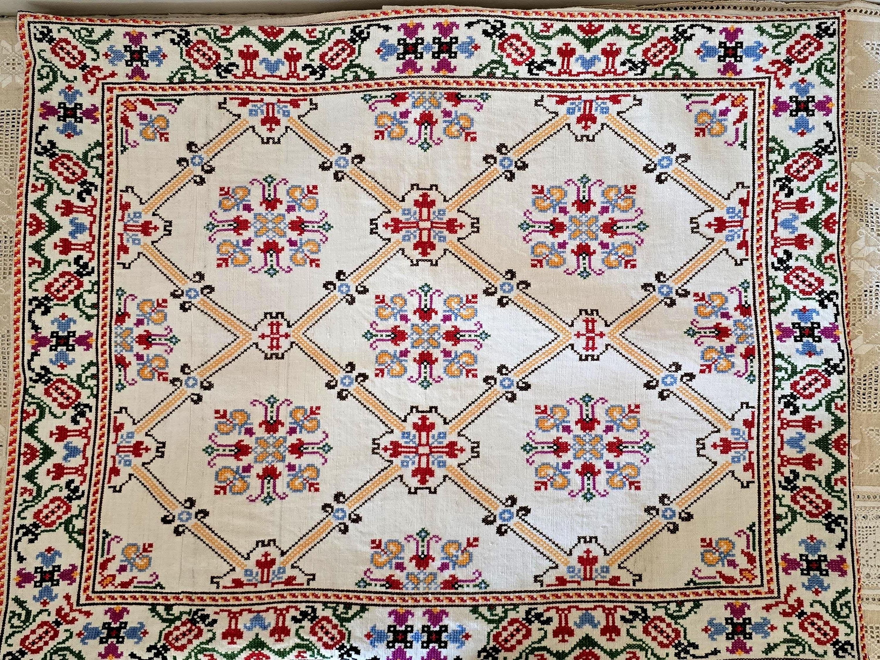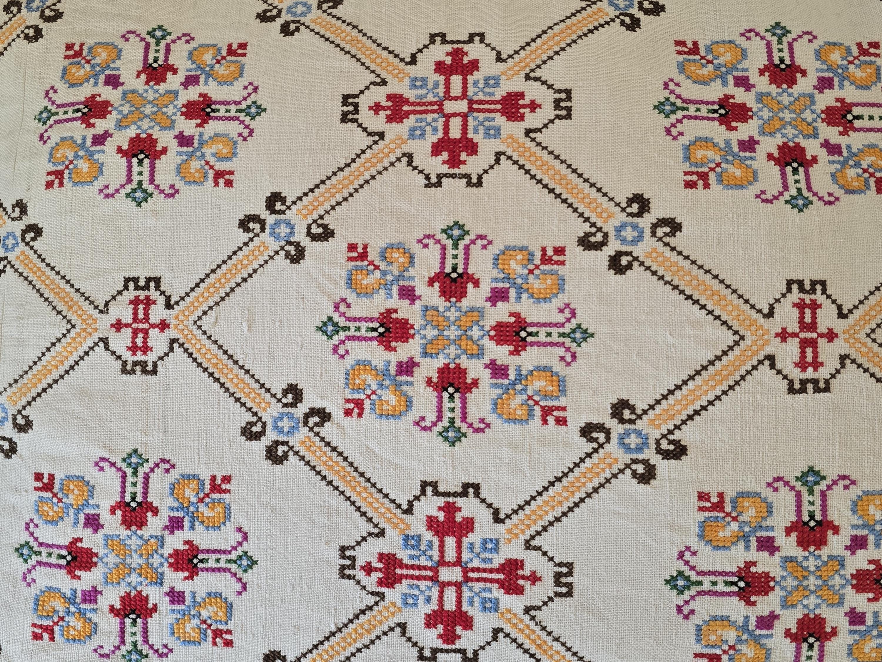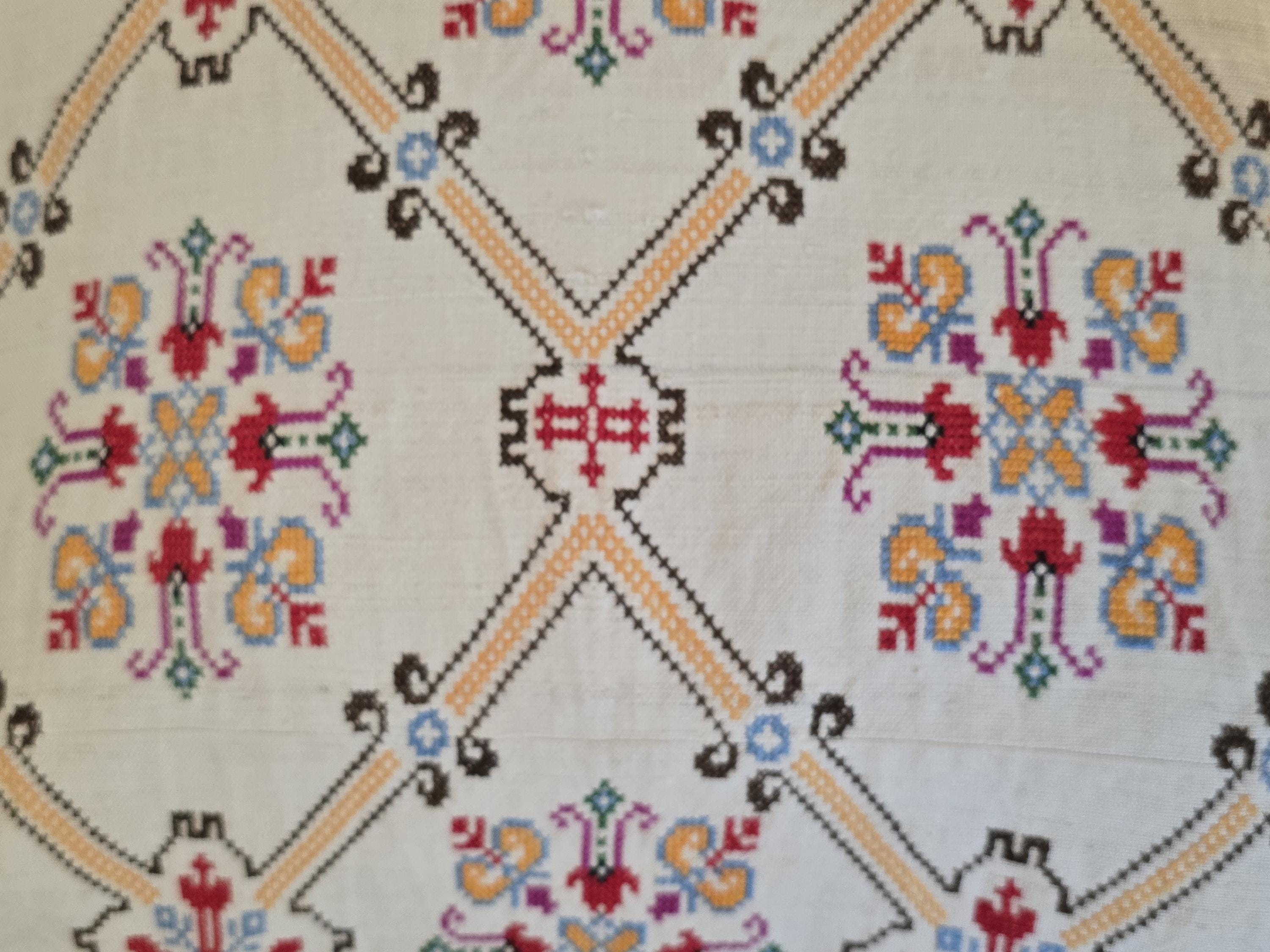 Cushion from Antique embroidery. Embroidered in cross-stitch on a home -loomed cloth. There is a seam in the cloth. Very pretty and in excellent condition