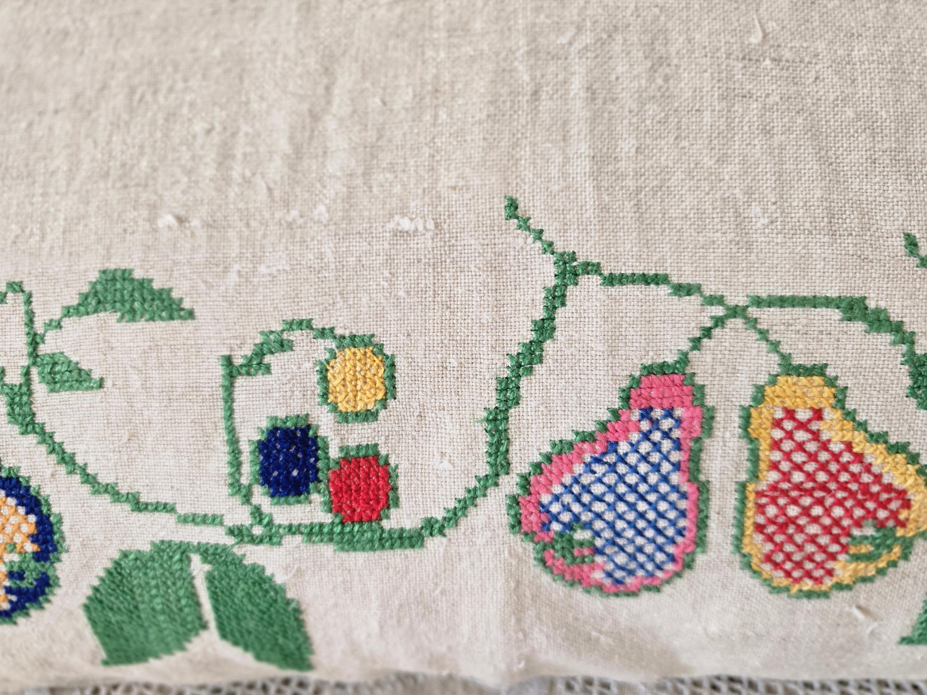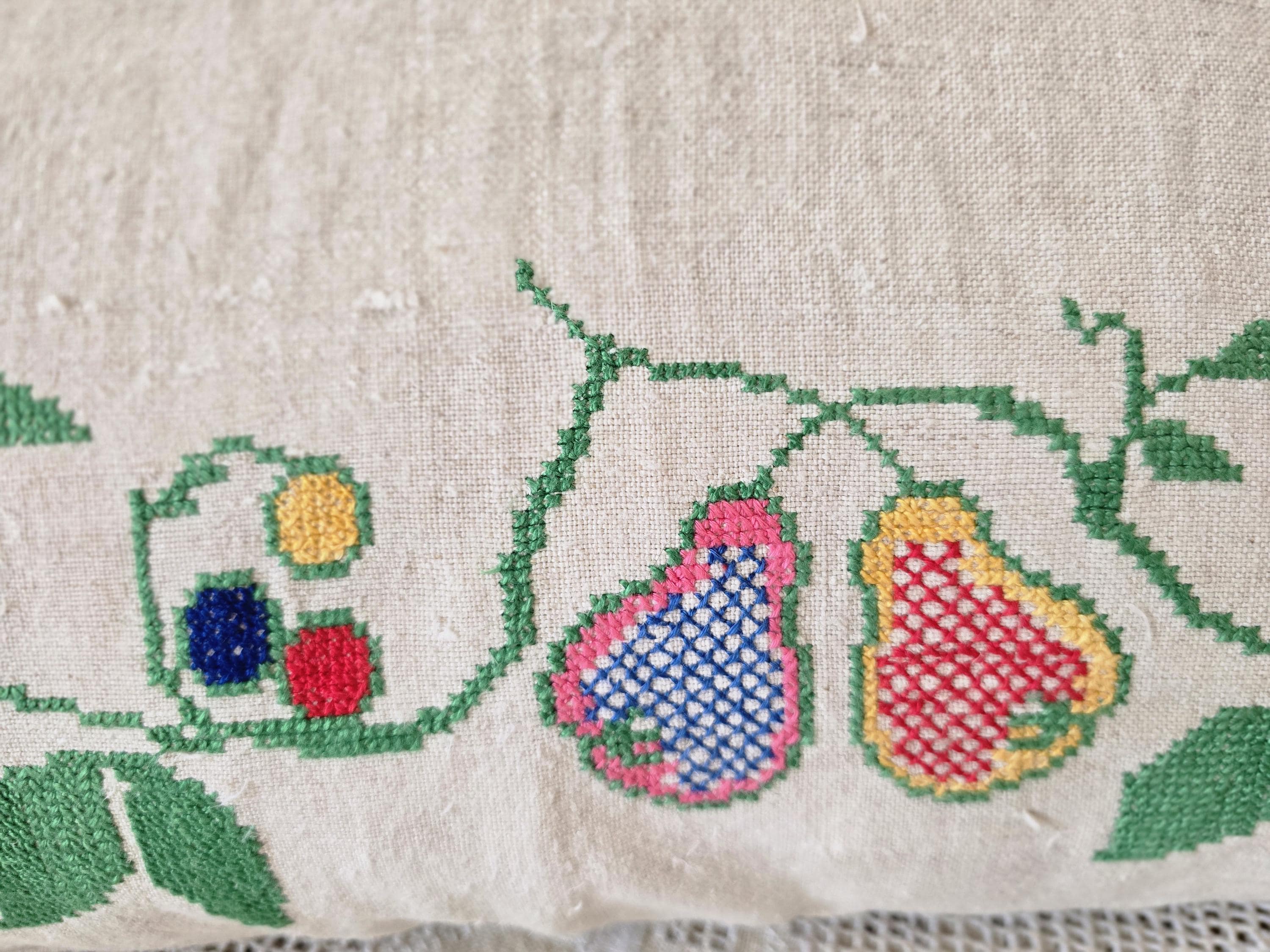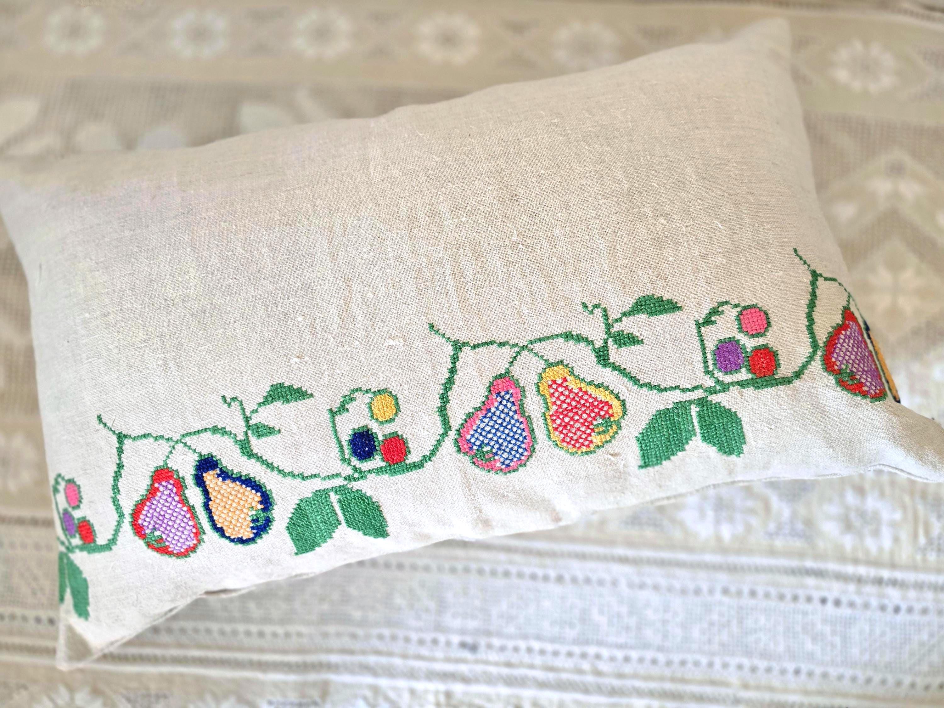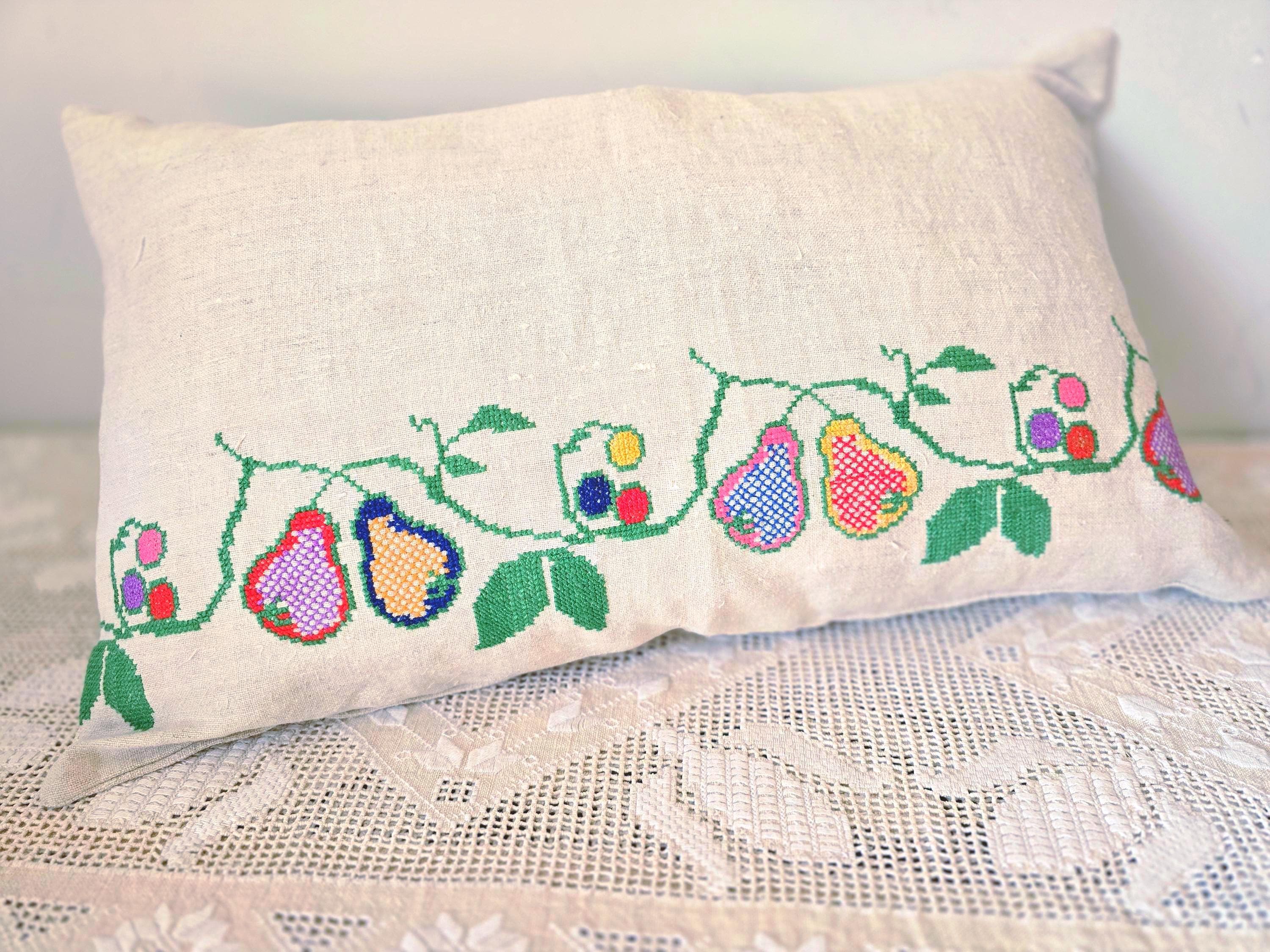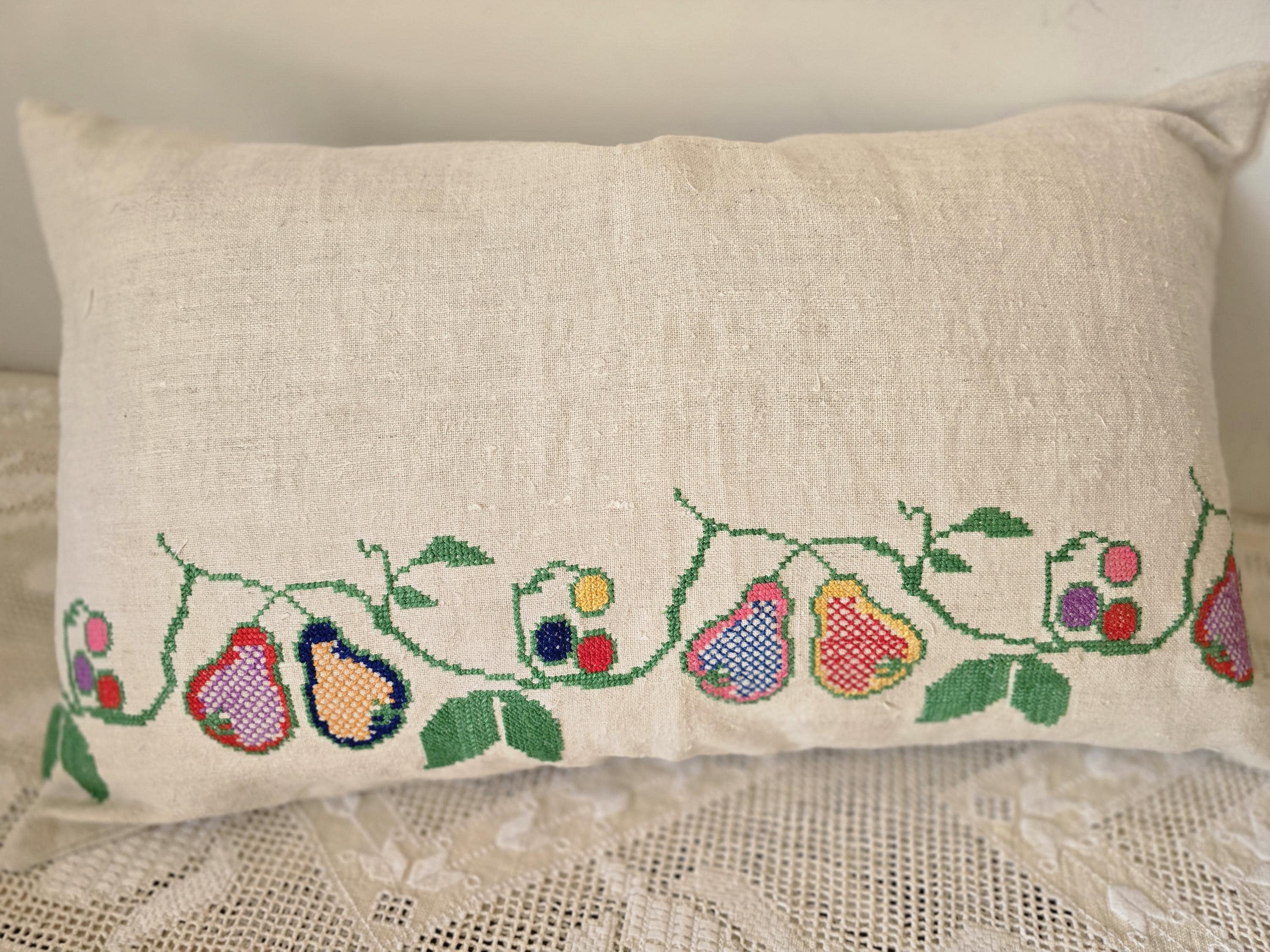 Cushion from vintage Hungarian cross stitch embroidery. Pears embroidered on a home-loomed linen cloth