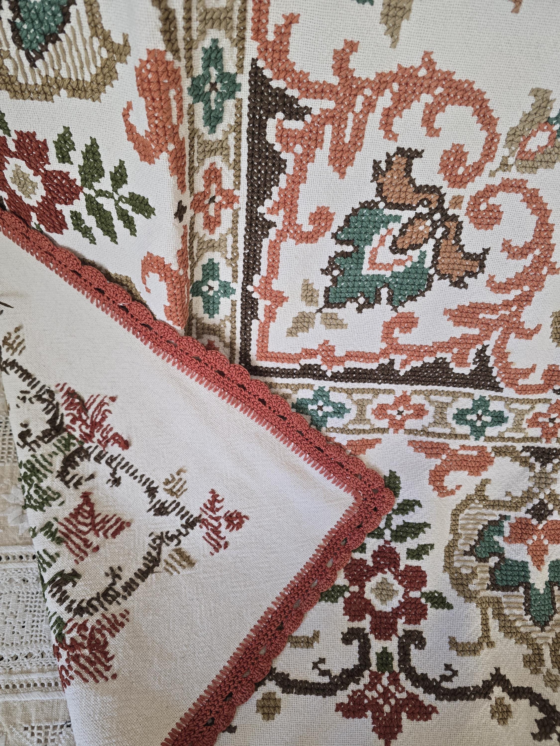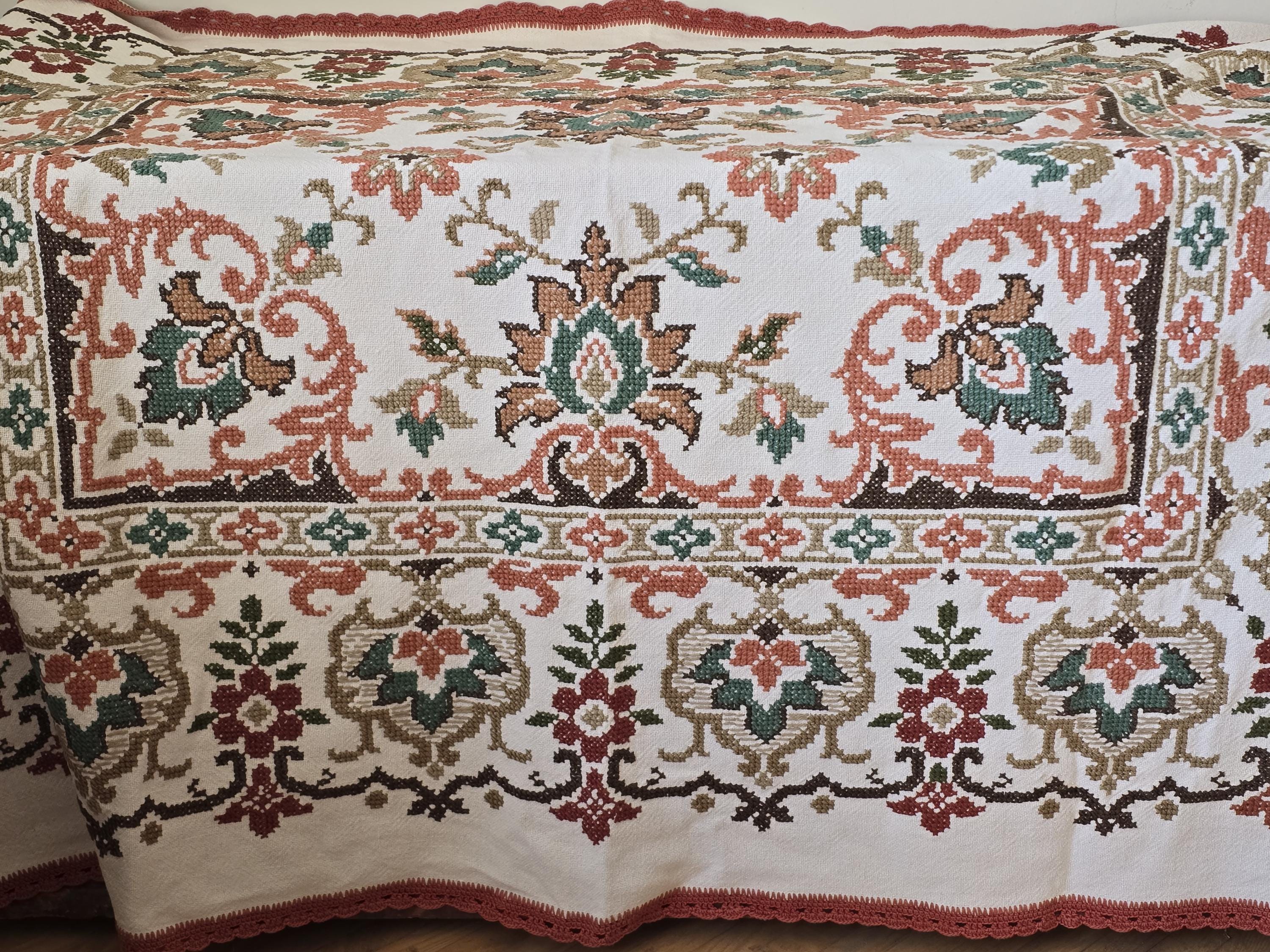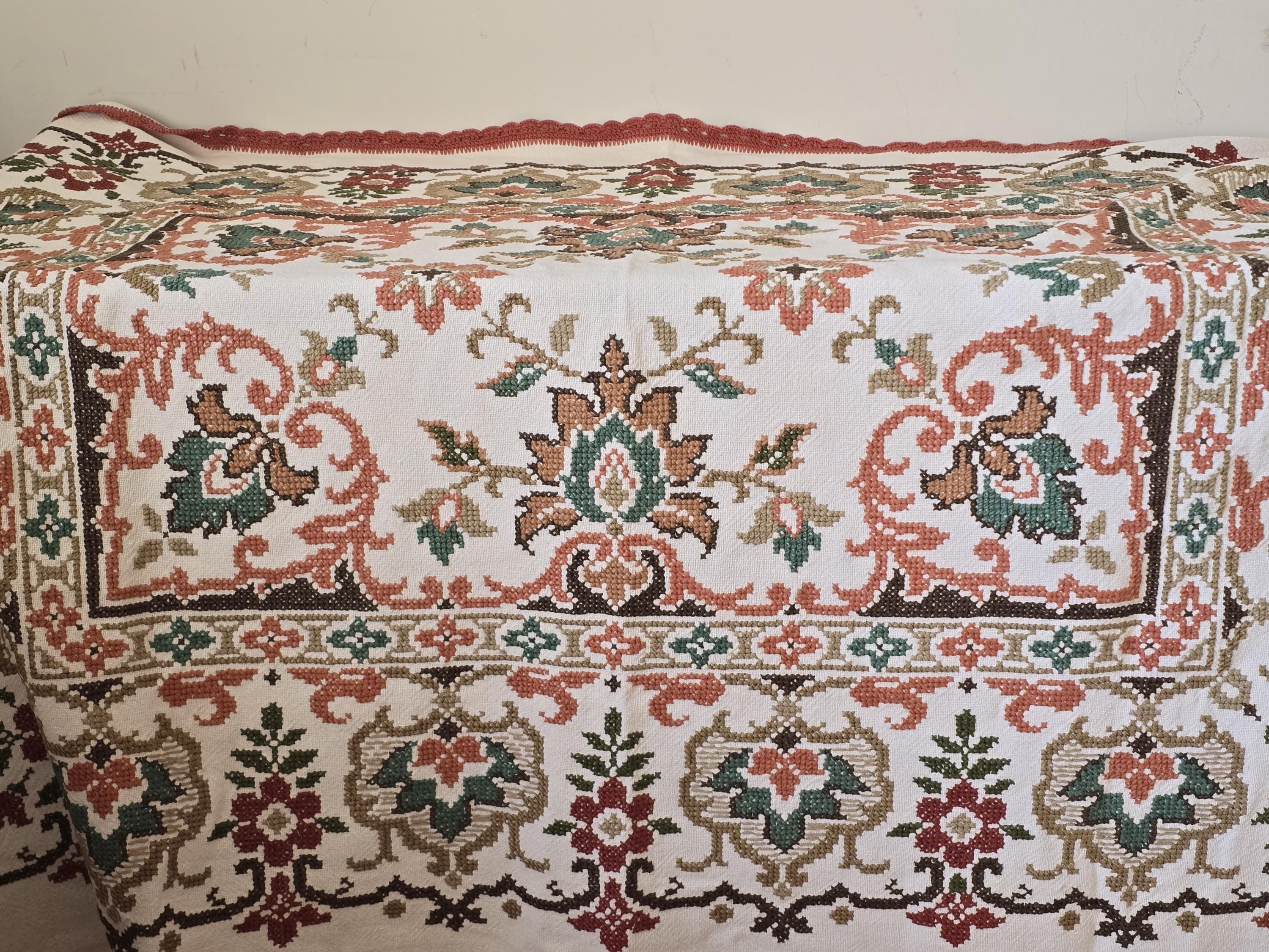 Beautiful vintage hand -embroidered table cloth with wonderful autumnal colours.Embroidered by hand in using cross stitch with a hand made lace trim.160x130cm I always refund excess postage paid and combine postage