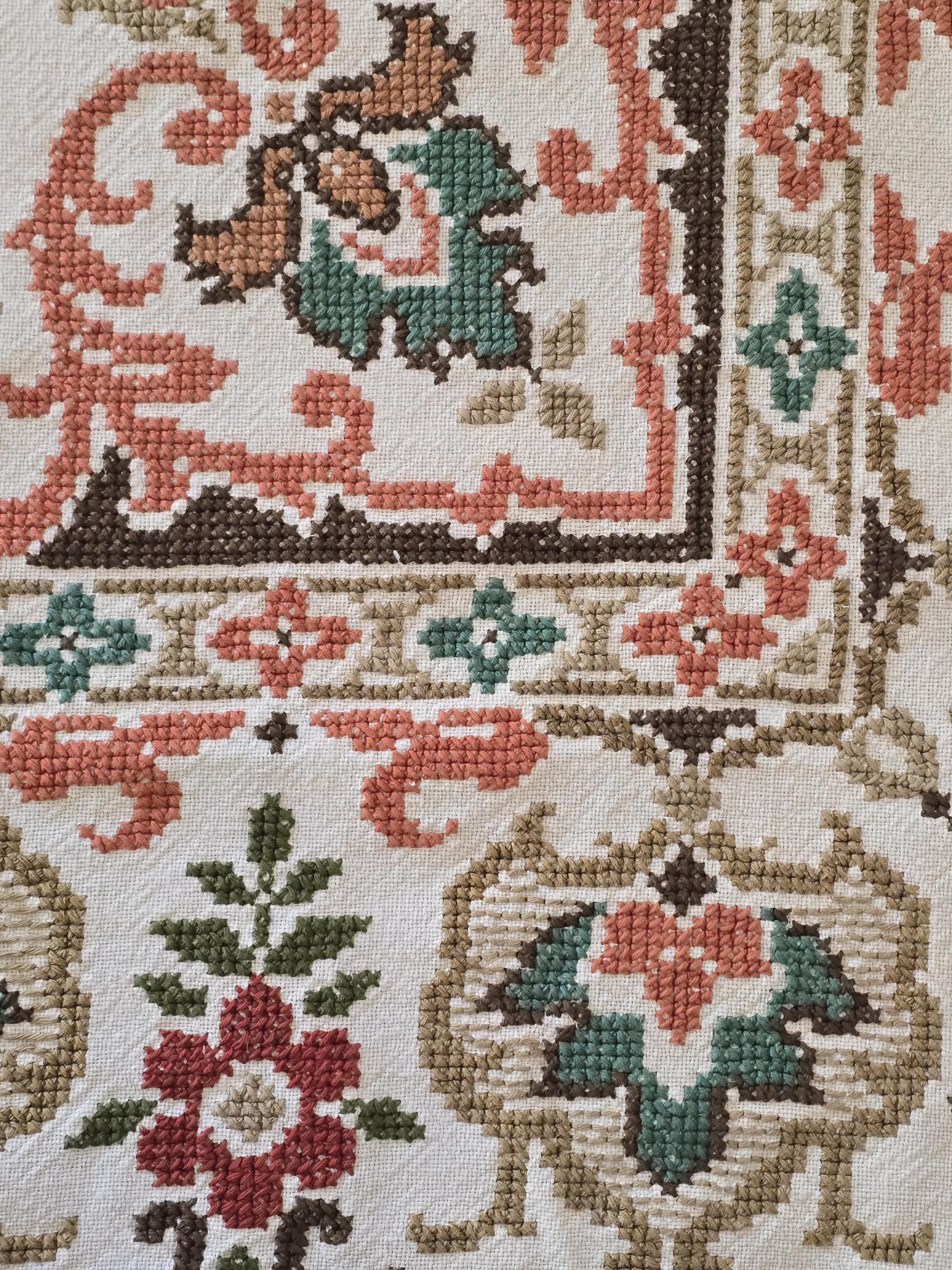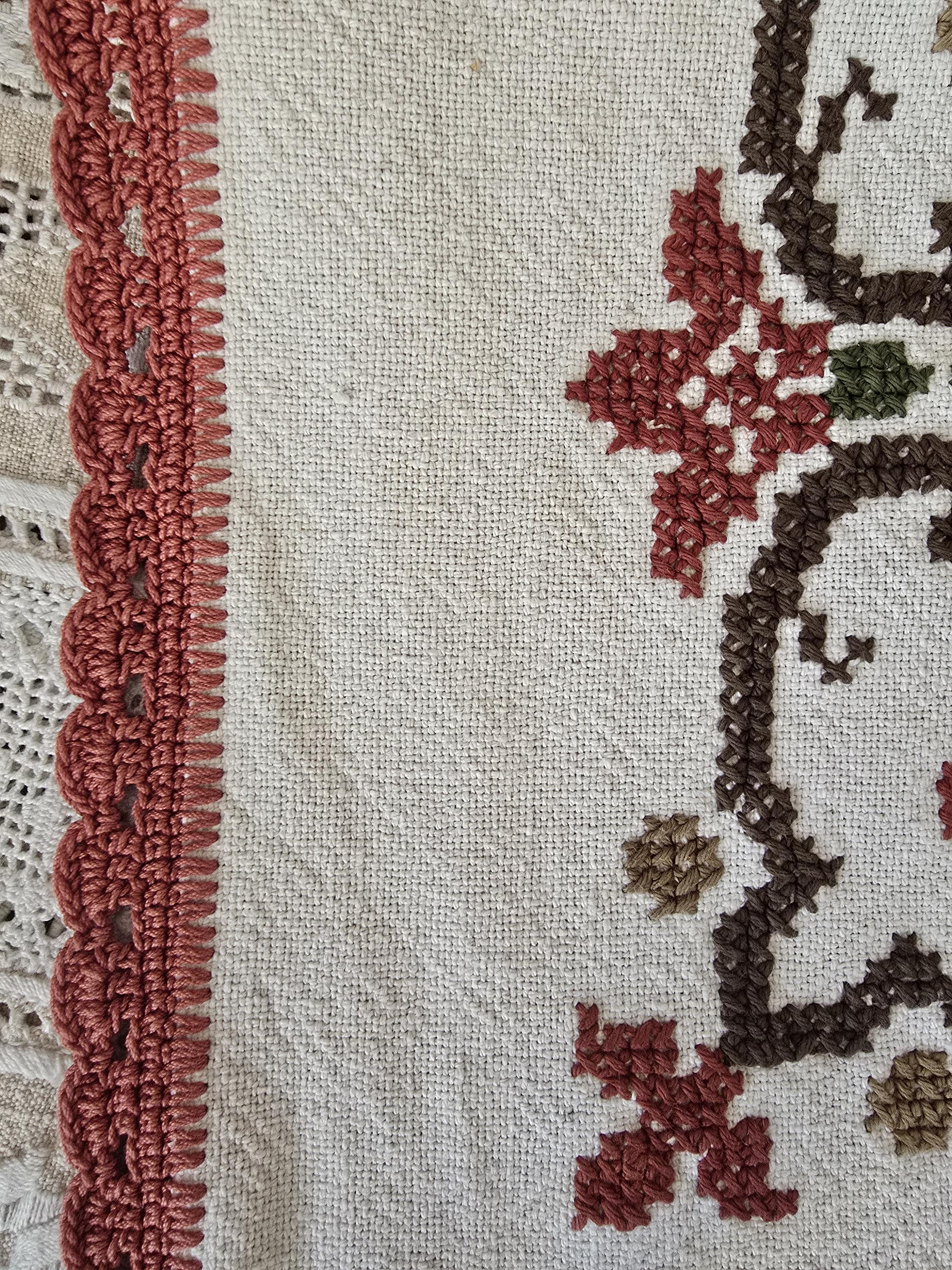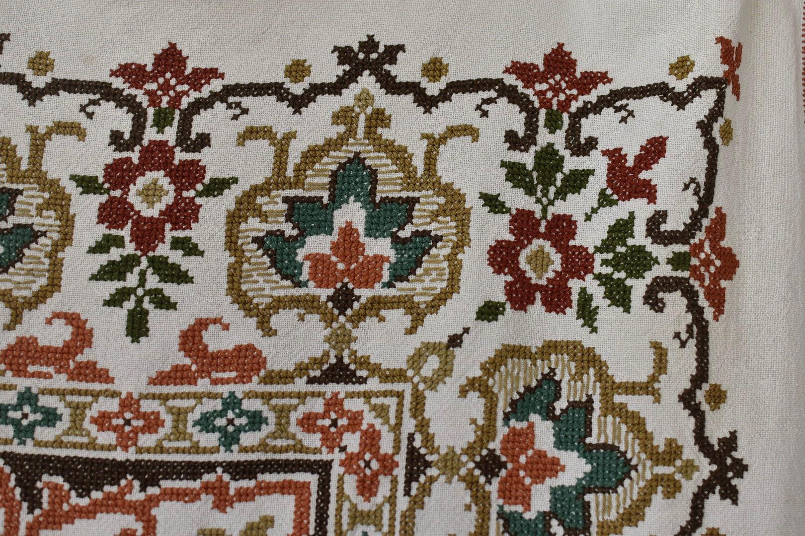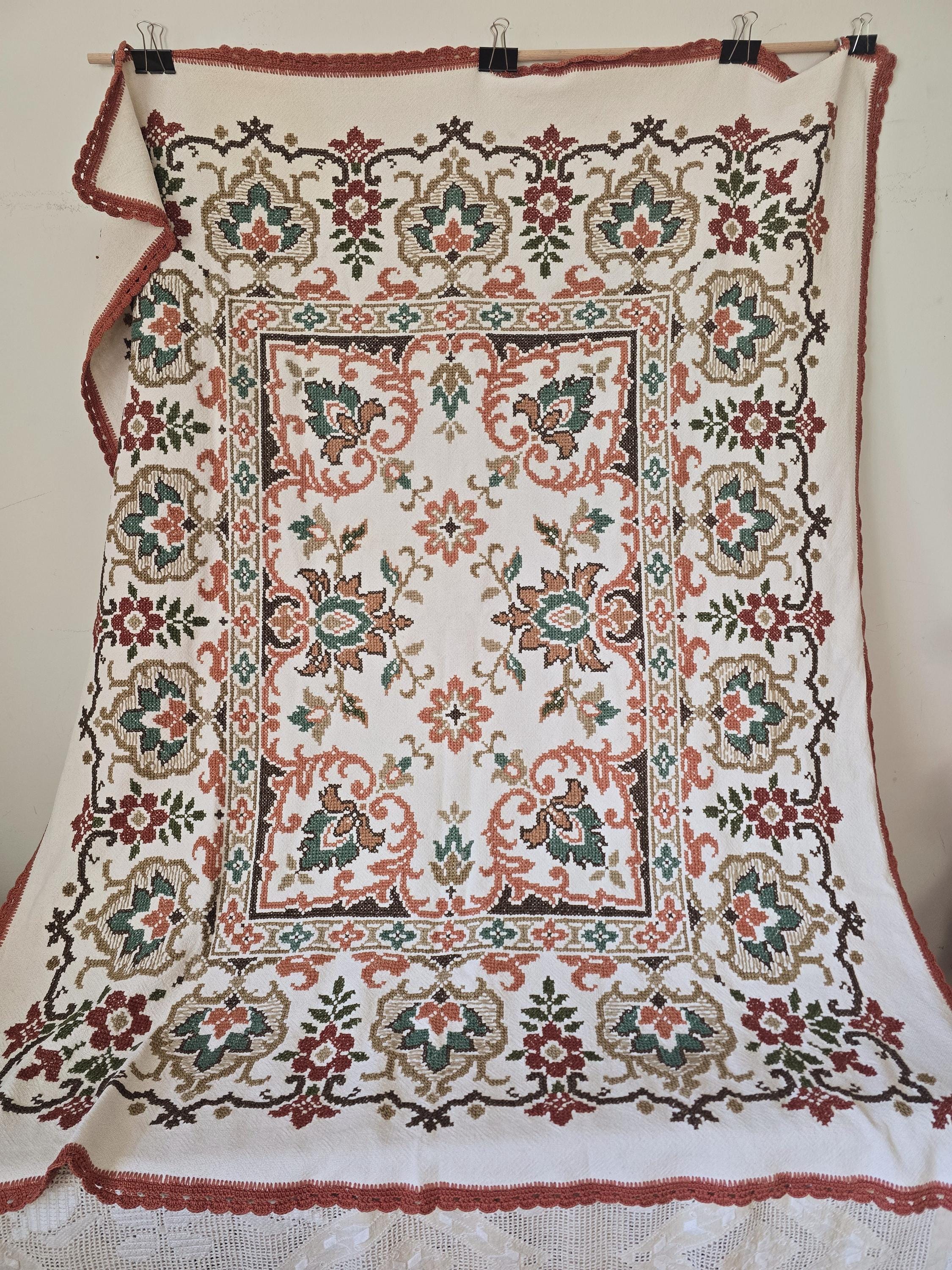 Beautiful vintage hand -embroidered table cloth with wonderful autumnal colours.Embroidered by hand in using cross stitch with a hand made lace trim.160x130cm I always refund excess postage paid and combine postage