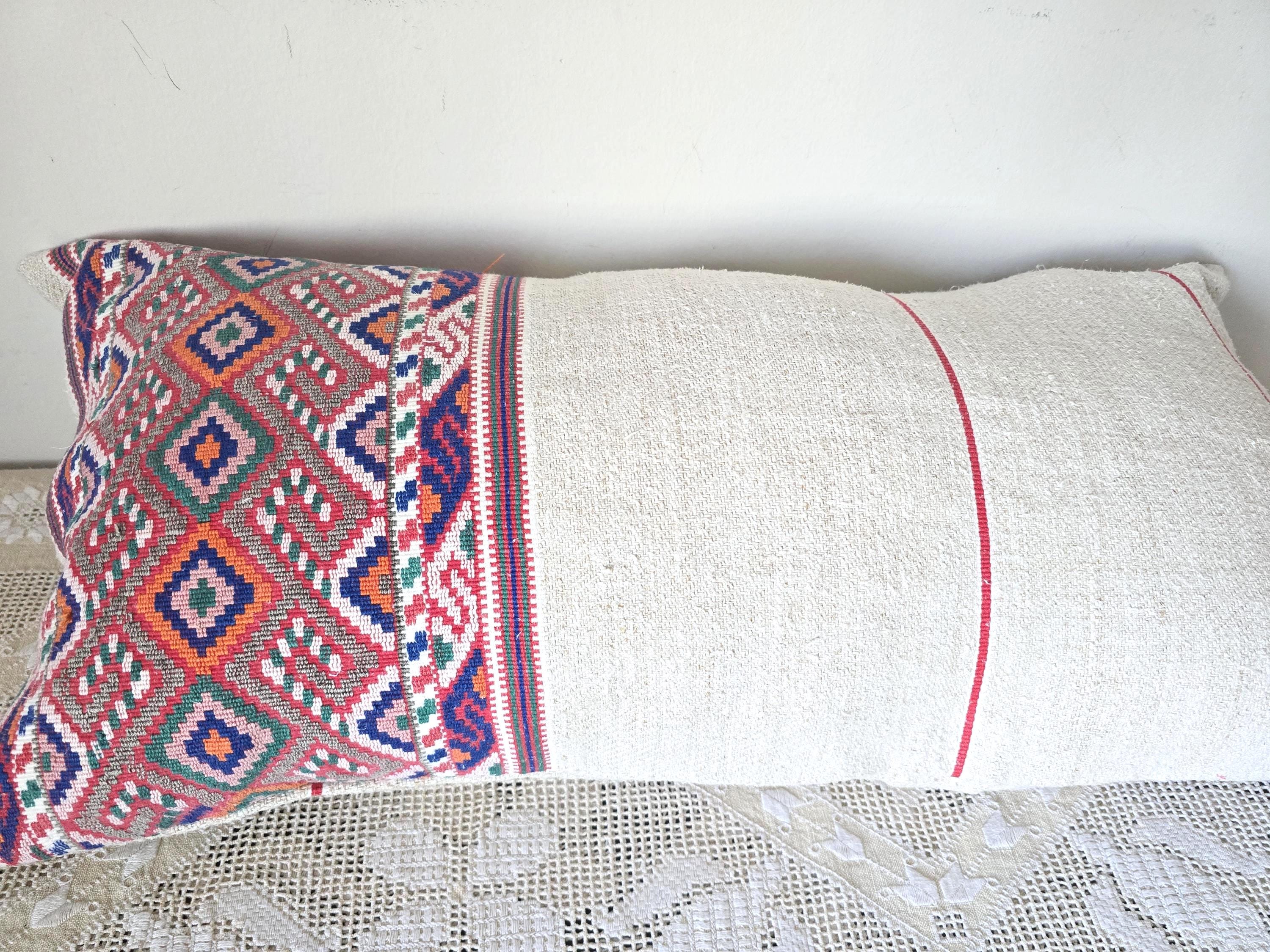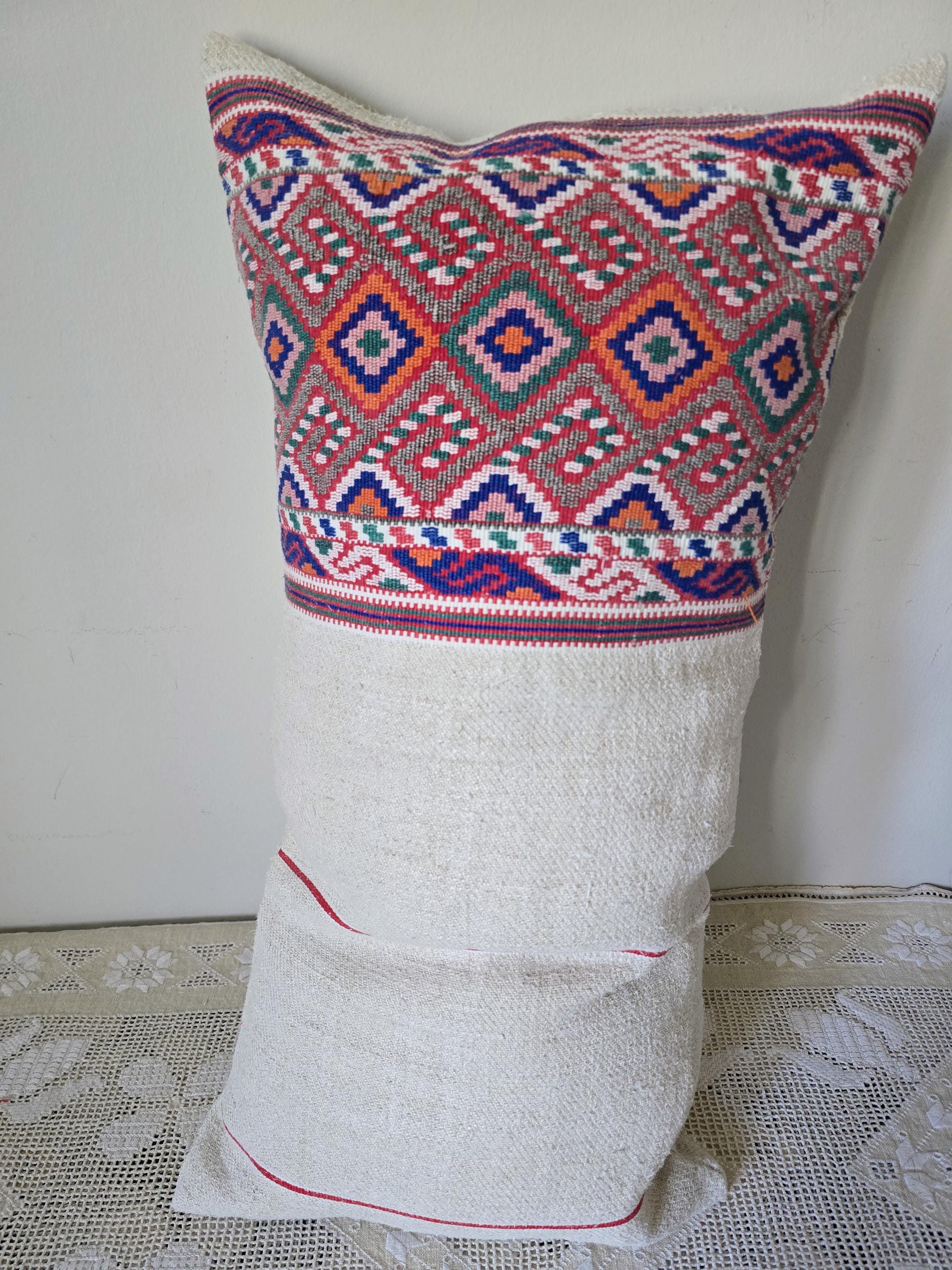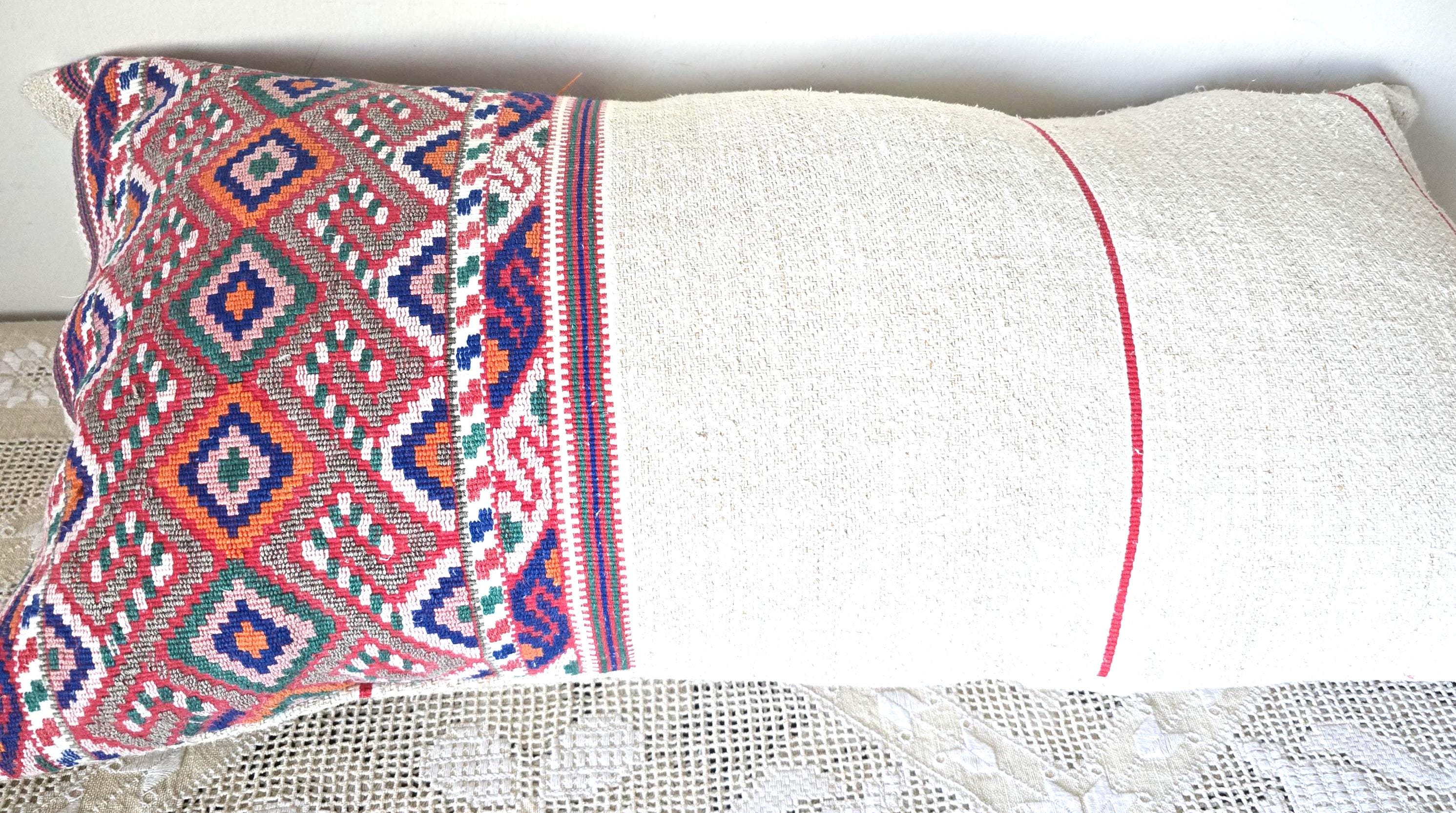Antique Romanian woven sack- shaped pillow cover. Pretty, delicate,weave, unusually fine.Home-loomed, hemp with decorative weave in cotton.Wooden button fastening 70x 37 cmInstagram @pararamarama, @folktextiles_parna