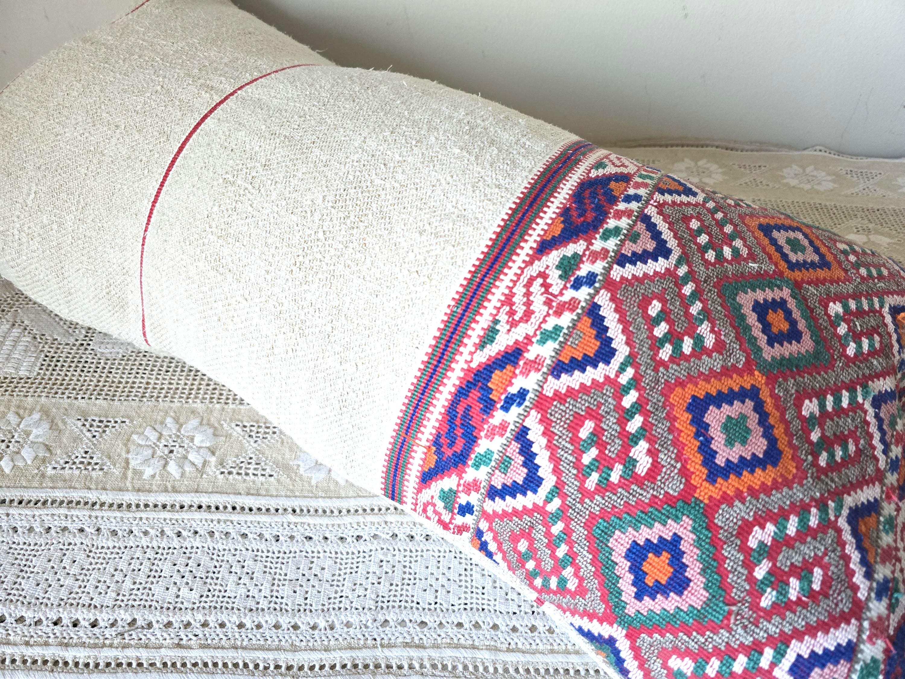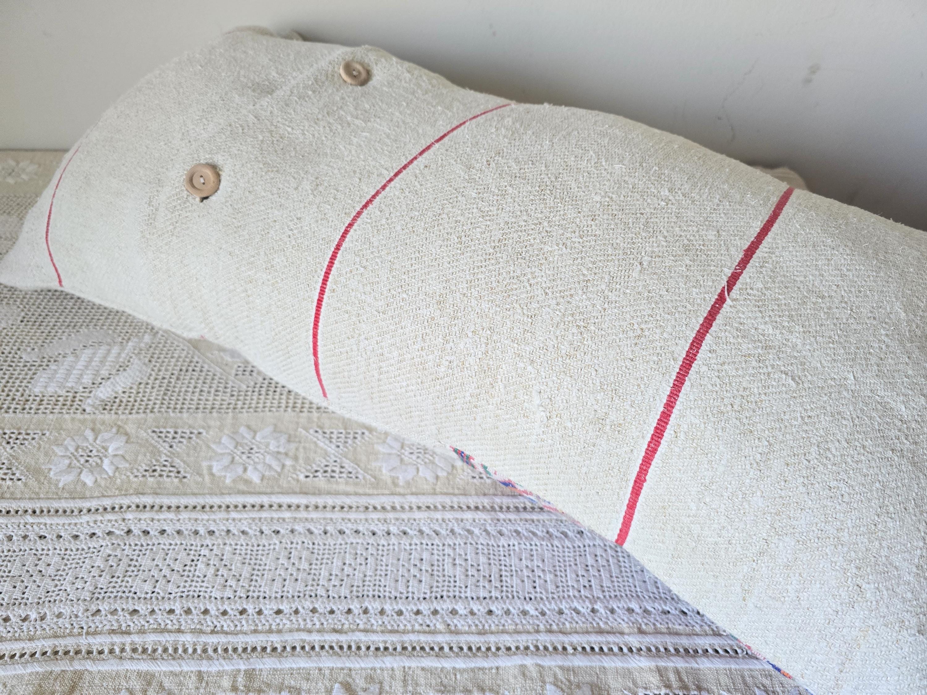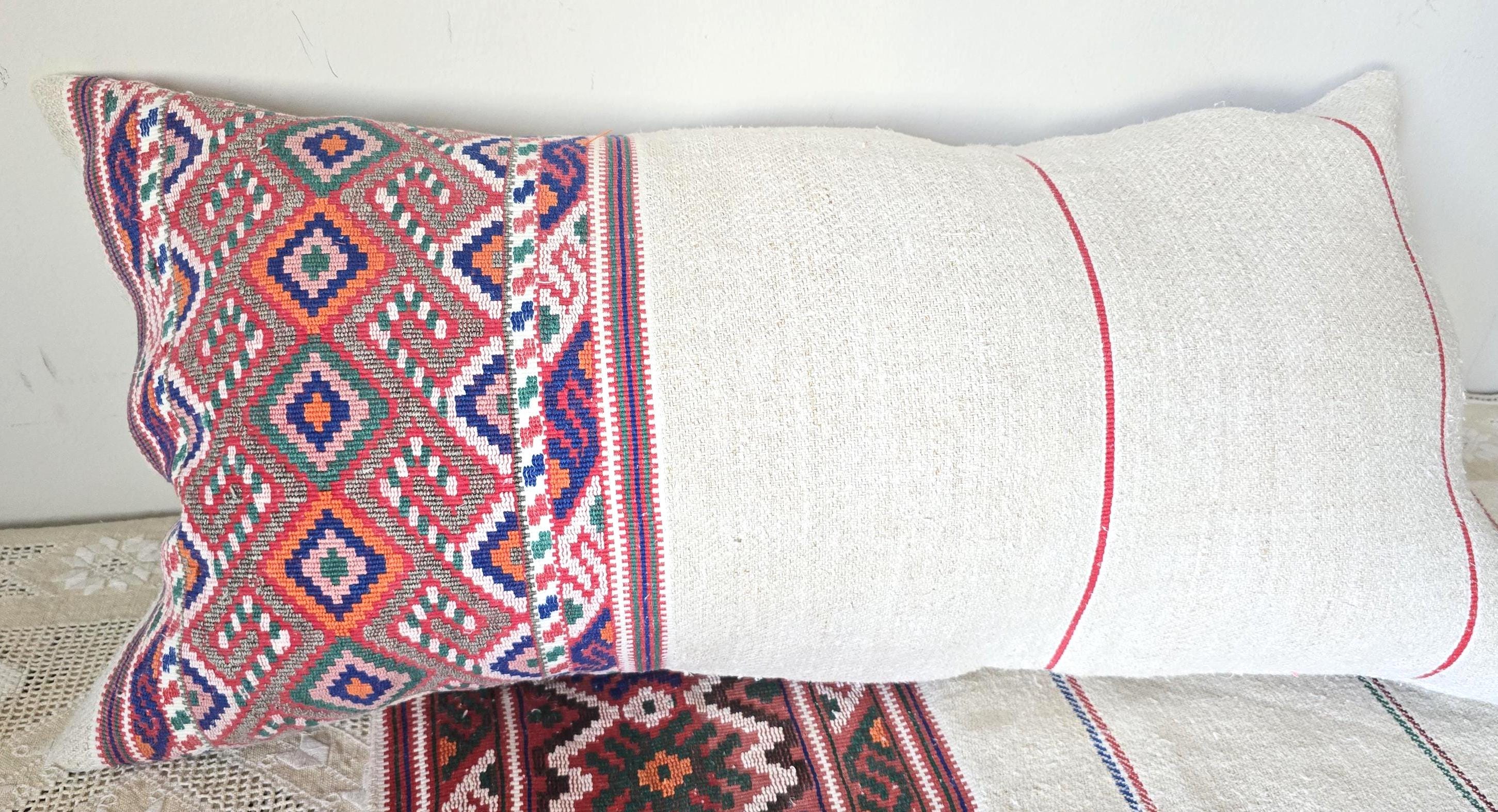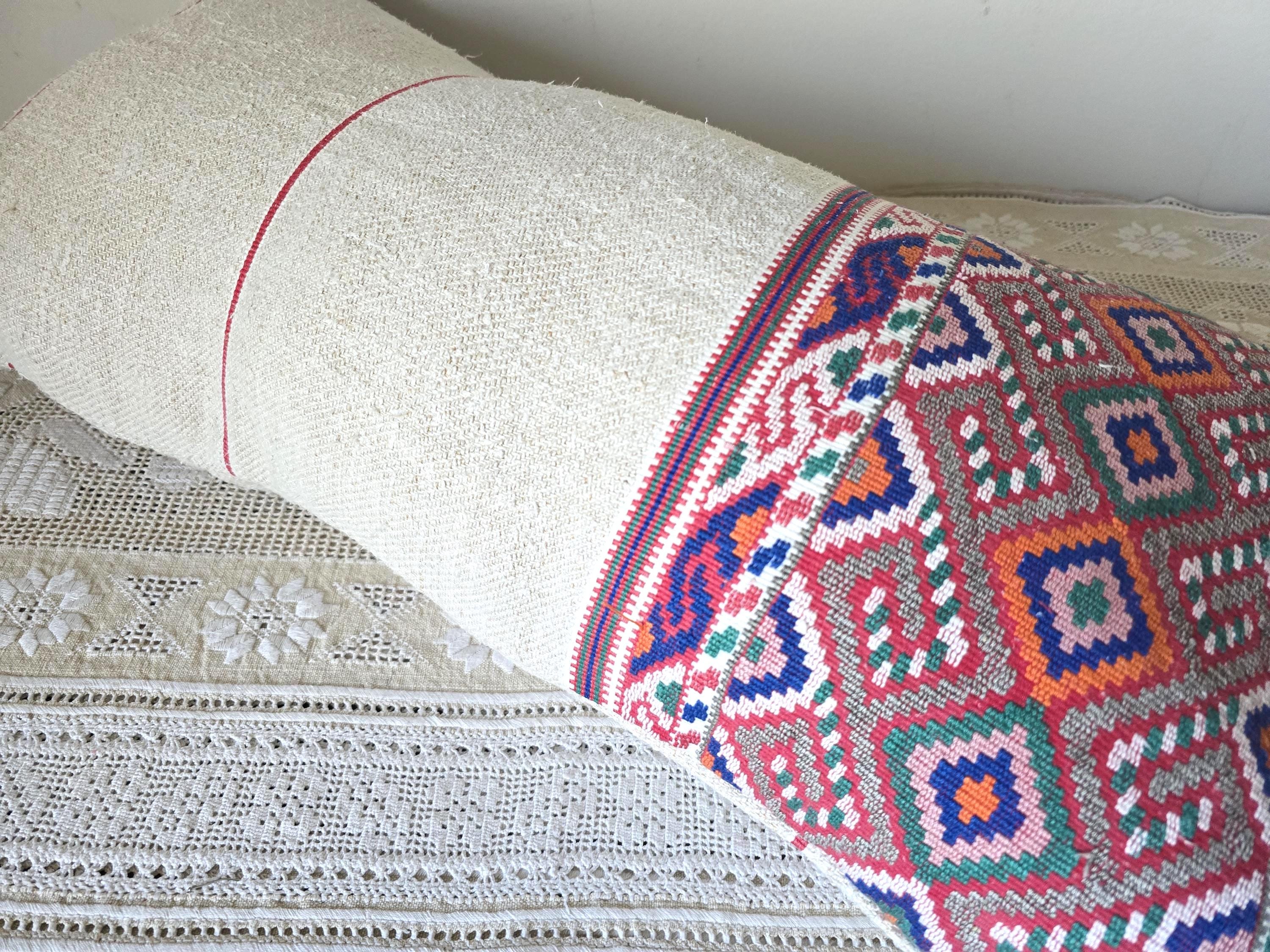 Antique Romanian woven sack- shaped pillow cover. Pretty, delicate,weave, unusually fine.Home-loomed, hemp with decorative weave in cotton.Wooden button fastening 70x 37 cmInstagram @pararamarama, @folktextiles_parna