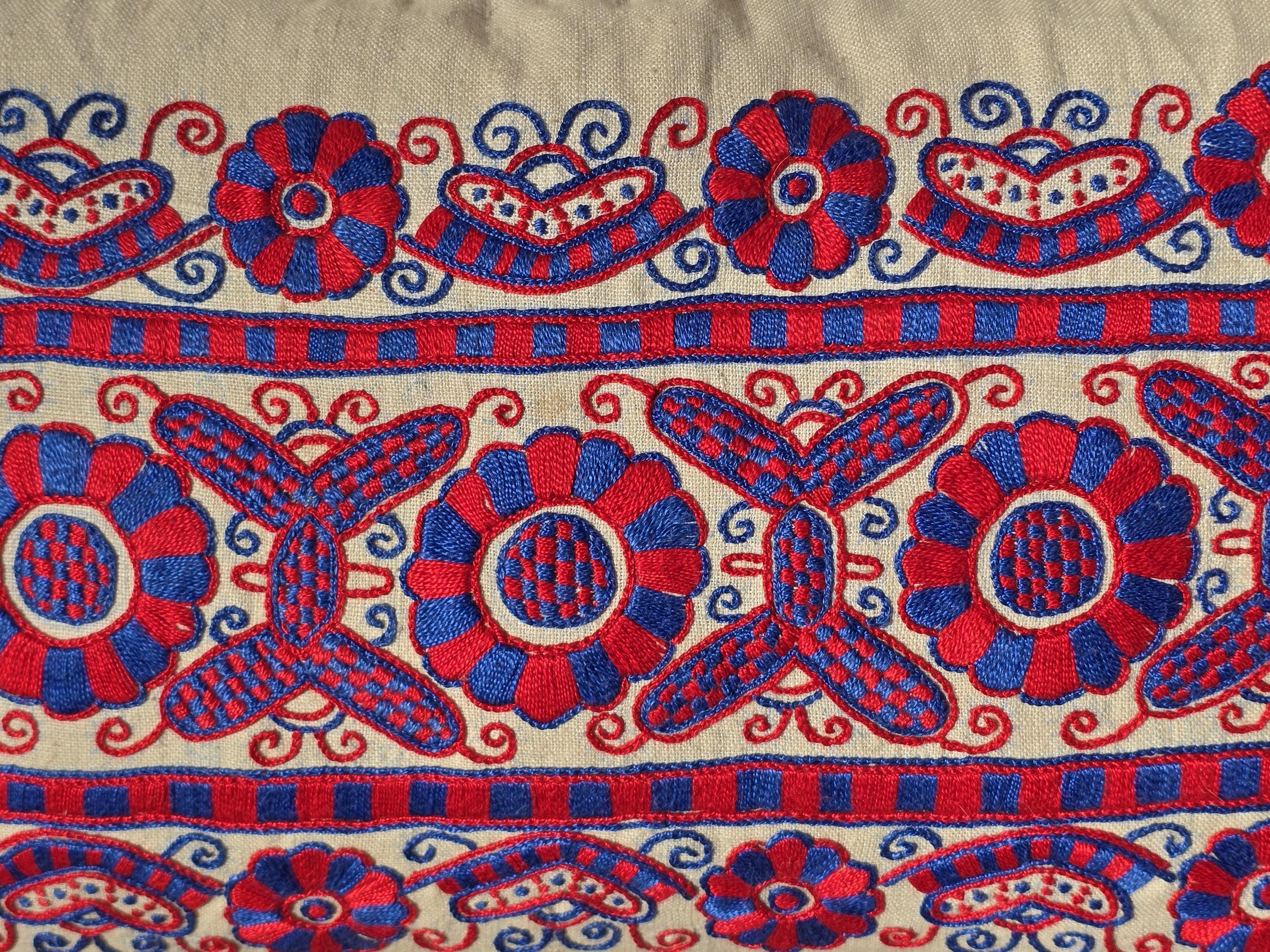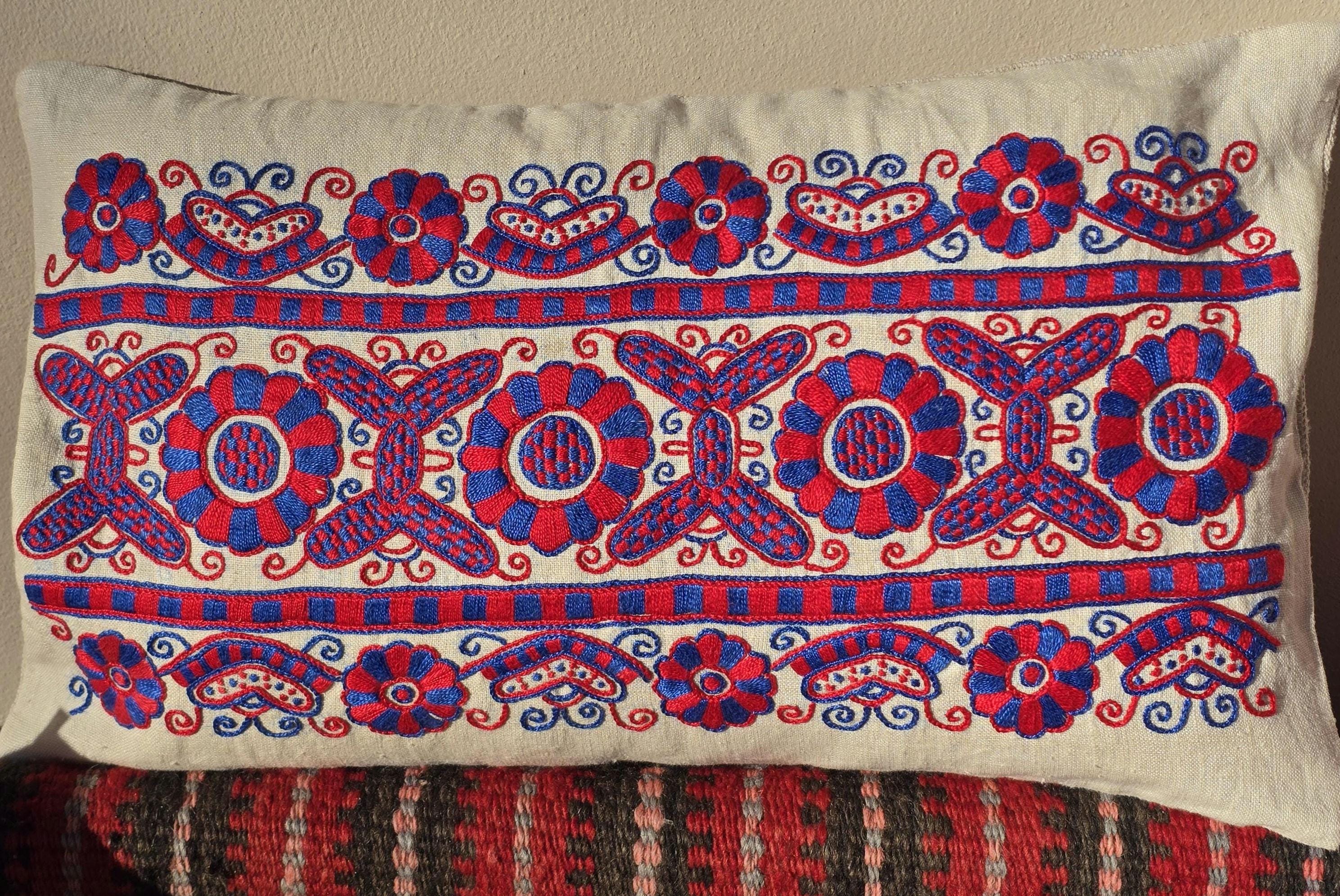 Vintage Hungarian (Buzsak) embroidery cushion cover. I have replaced the damaged back with plain vintage linen. Wooden button fastening