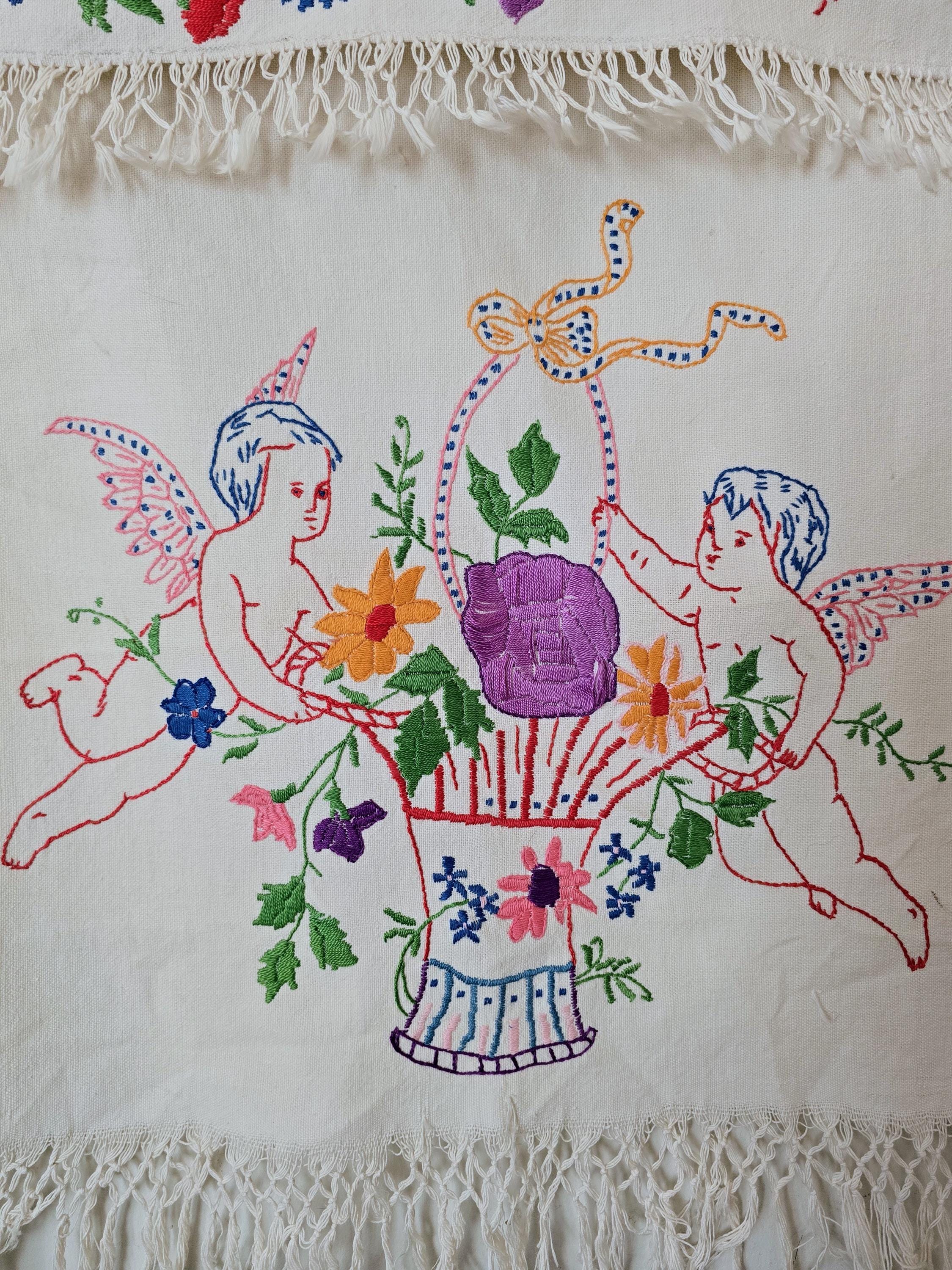Pretty vintage hand-embroidered cloth, made to be displayed draped over a rail so that both the top portion embroidered on the other side of the cloth as the main embroidery is shown.