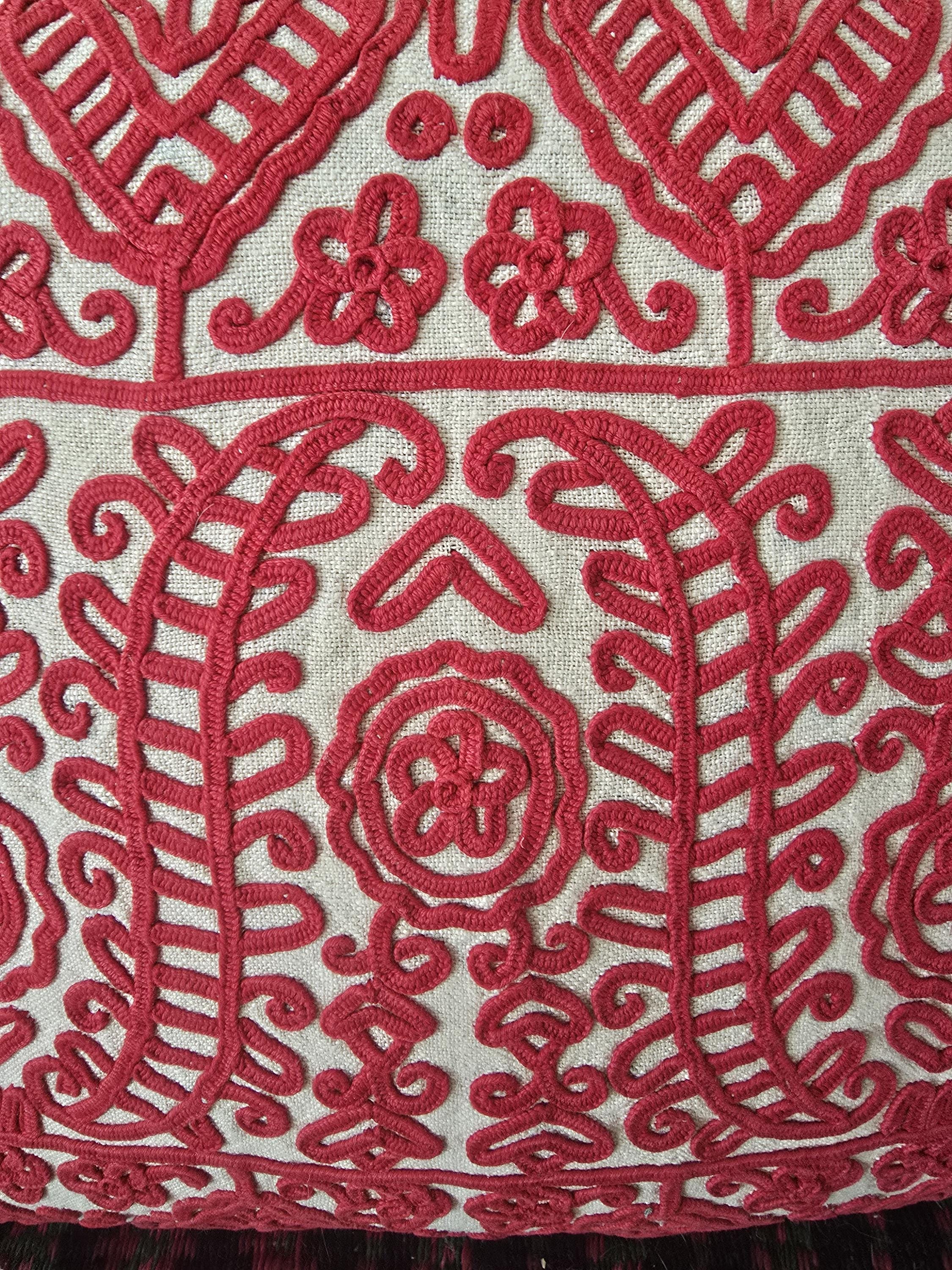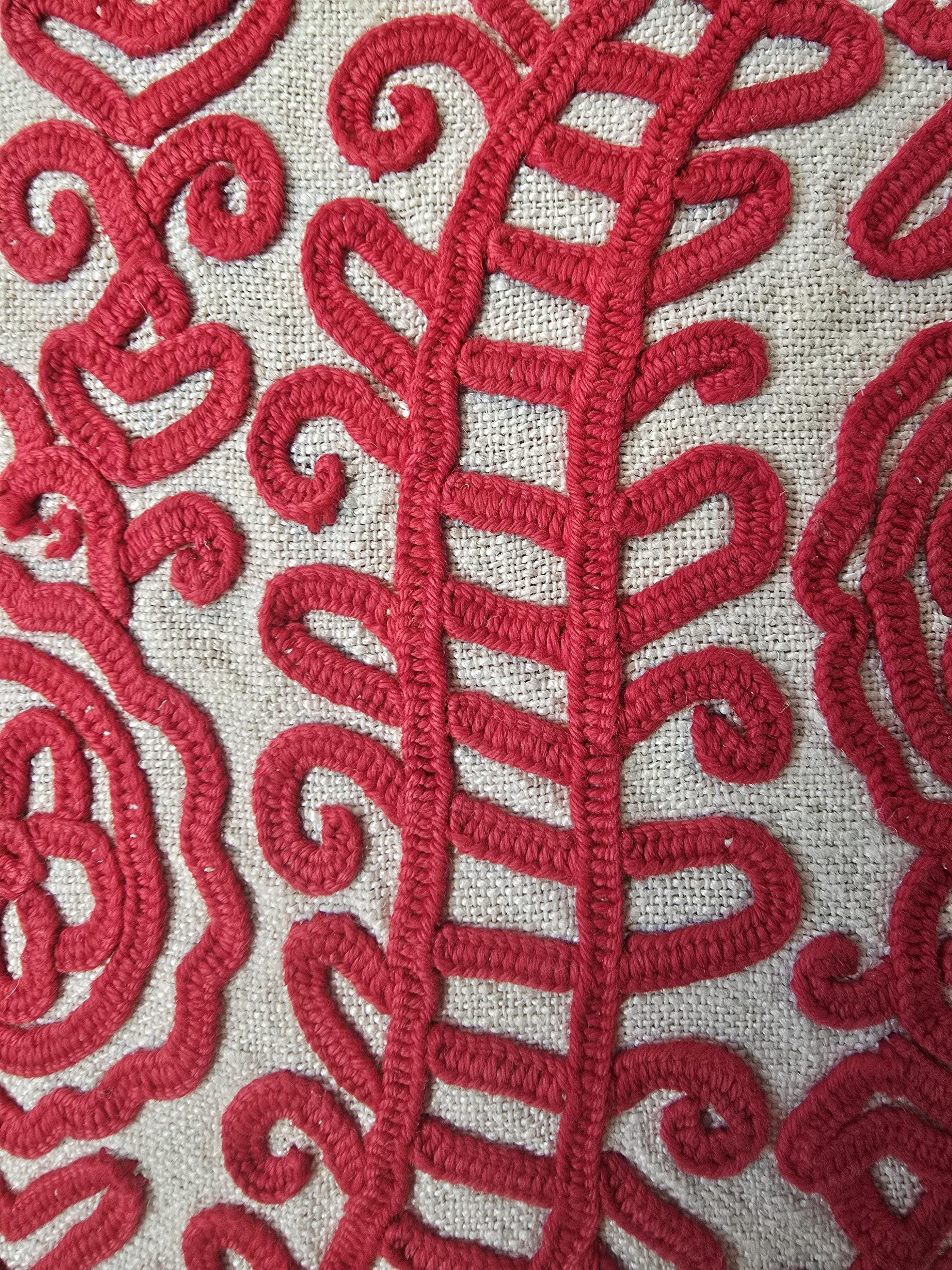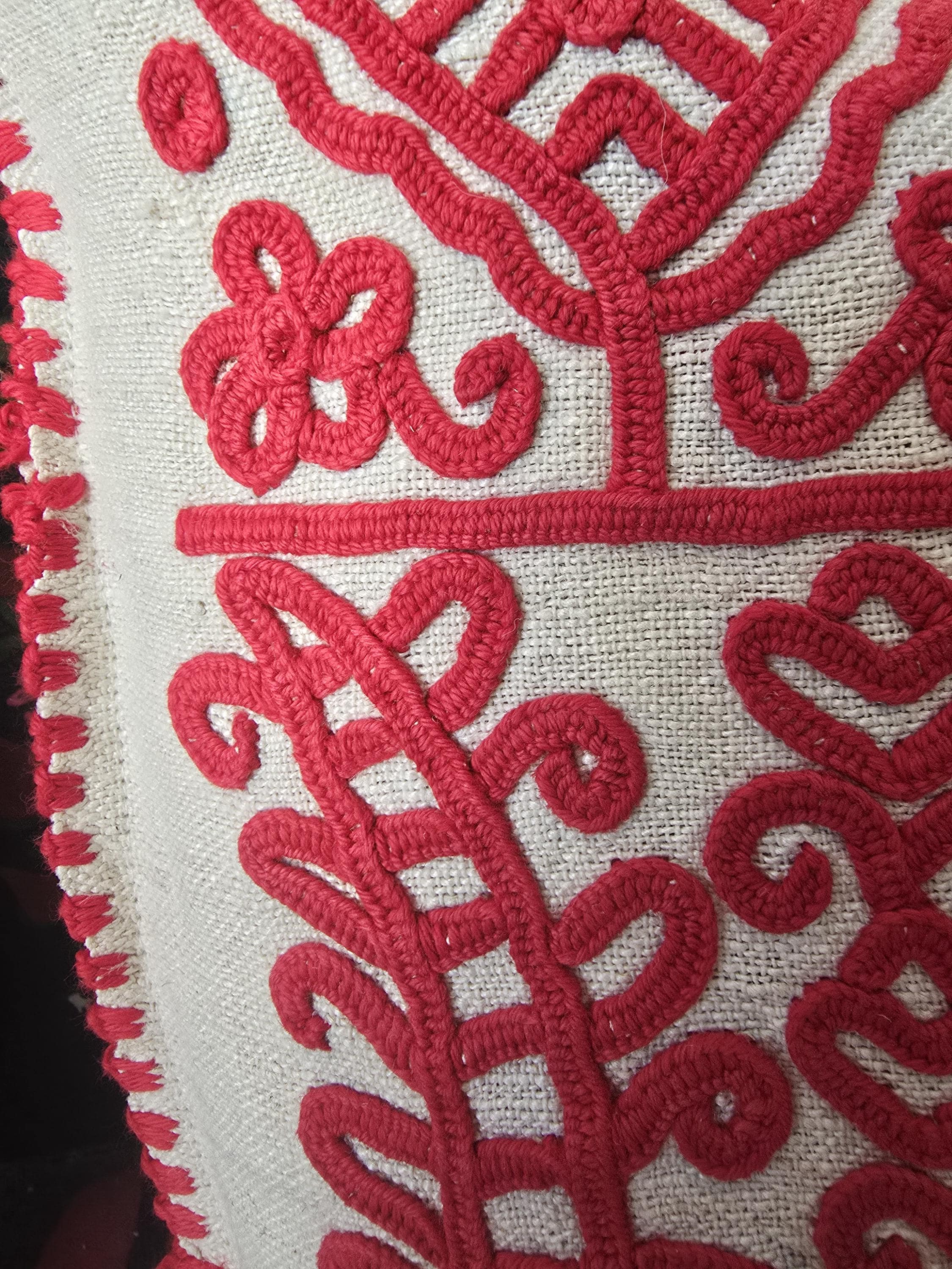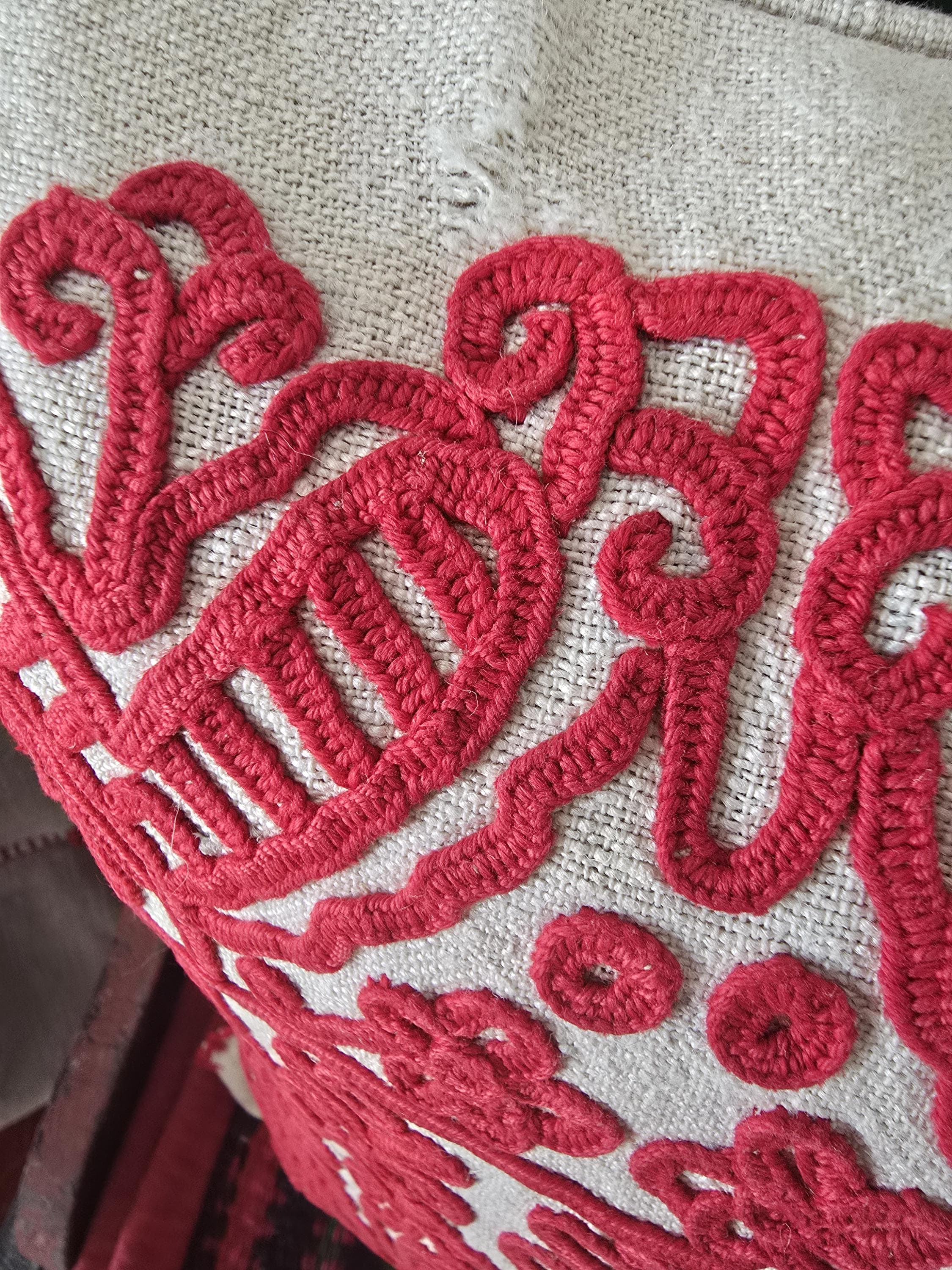 Red embroidery on a home-loomed hemp cloth.Cloth is thin in places