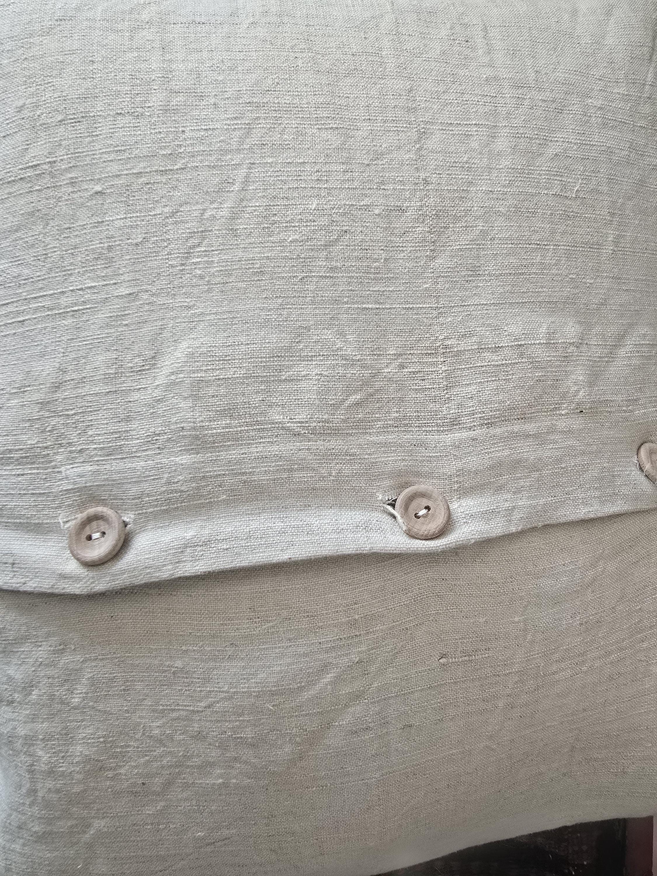 I have replaced the back with vintage home- woven linen. Wooden button fastening.
